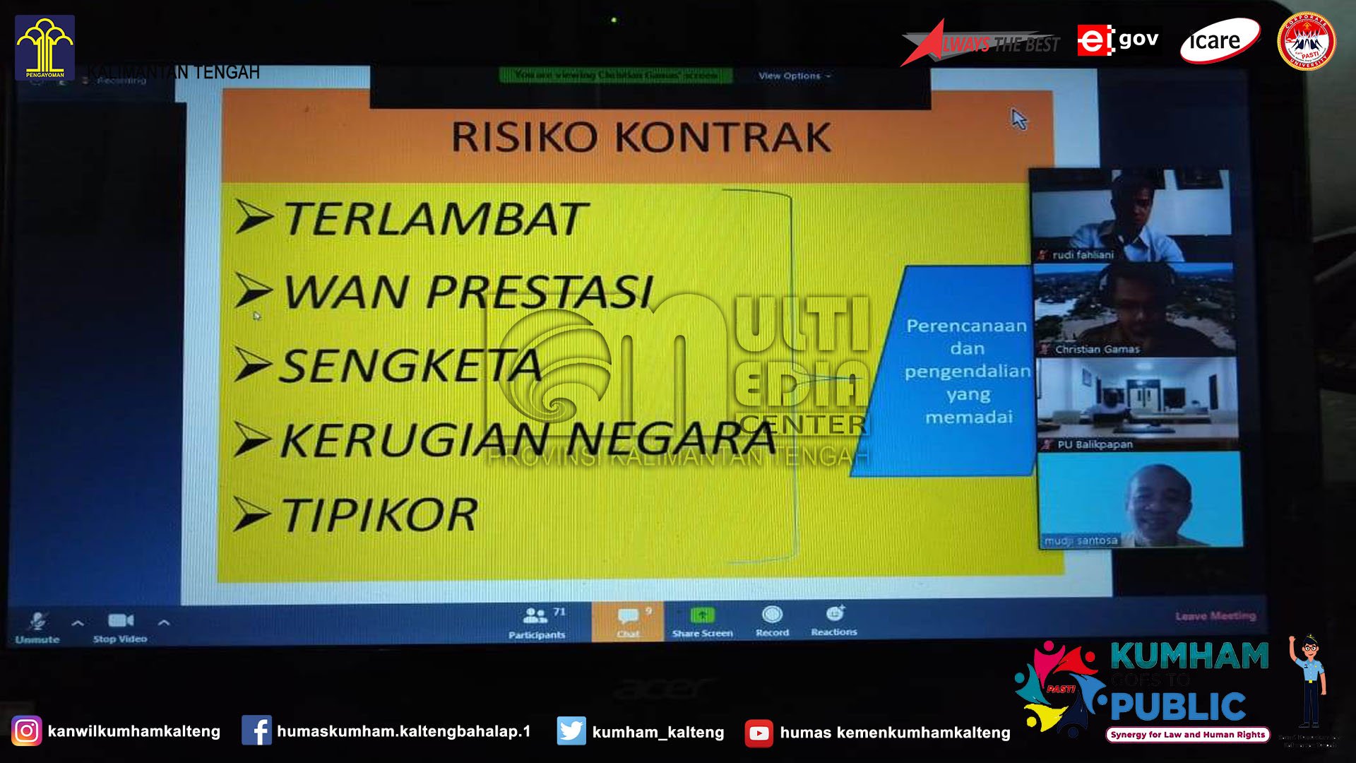 MMCKalteng - Palangka Raya - Berdasarkan undangan melalui Surat Kepala Bagian Pengadaan Barang Jasa Pemerintah Kabupaten Kutai Barat Nomor : 005/131/PBJ/IV/2020, JFT Pengelola Pengadaan Barang/Jasa Rudi Fahliani dan Arinnandi serta pengelola keuangan kantor wilayah Kementerian Hukum dan HAM Kalimantan Tengah Ahmad Irvansyah tampak dengan serius mengikuti seluruh rangkaian kegiatan Diseminasi Peningkatan Kinerja Organisasi Pengadaan Barang/Jasa Pemerintah yang mengambil tema “Pengendalian Kontrak Pengadaan Barang/Jasa” sesuai dengan jadwal yang telah diberikan sebelum nya, pada hari Selasa (21/4/2020).
