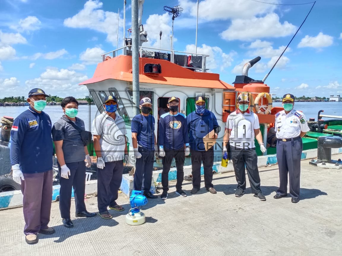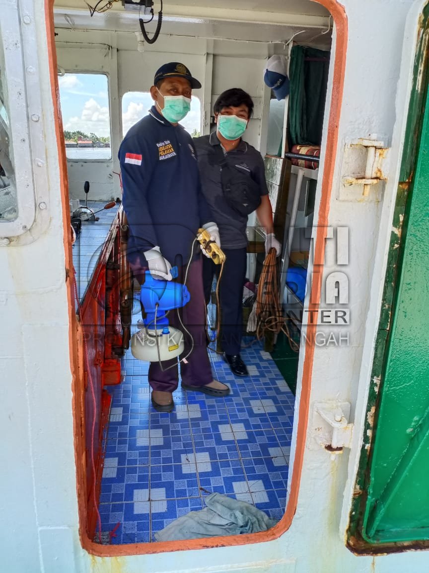 mmckalteng - KUALA KAPUAS – Dalam upaya pencegahan penyebaran virus Pandemic Covid-19 yang semakin mewabah, Dinas Perhubungan (Dishub) Kabupaten Kapuas bersama Kantor Kesehatan Pelabuhan (KKP) Cabang Kuala Kapuas memeriksa dan melakukan penyemprotan terhadap kapal jenis Tug Boat yang hendak menuju Kecamatan Mantangai di Dermaga Danau Mare Kuala Kapuas, Jumat (8/5/2020) siang.