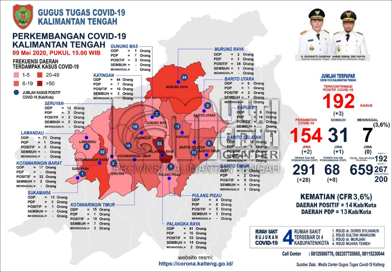 Berdasarkan data yang dikeluarkan oleh tim Gugus Tugas Percepatan Penanganan Covid-19 Provinsi (Kalteng), hingga Sabtu (09/05/2020), tercatat total kasus positif di wilayah Kalteng mencapai 192 orang. Dilaporkan hingga Jumat (08/05/2020) total kasus positif hanya berjumlah 189 orang. Terjadi penambahan pada pasien positif dalam 24 jam terakhir sebanyak 3 orang.