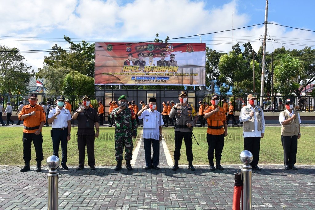 mmckalteng - KUALA KAPUAS – Bertempat di halaman Markas Komando (Mako) Polres Kapuas digelar Apel Gabungan kesiapan pasukan pengamanan Pembatasan Sosial Berskala Besar (PSBB) Kabupaten Kapuas, Rabu (3/6/2020) pagi. Hadir dalam kesempatan tersebut Wakil Bupati Kapuas HM Nafiah Ibnor, Ketua Pengadilan Negeri Ruslan Hendra Irawan, Kepala Dinas Komunikasi dan Informatika Kabupaten Kapuas Dr H Junaidi, Kepala BPBD Panahatan Sinaga, Kepala Dinas Kesehatan Apendi, Kepala Dinas Perhubungan Vitrianson, serta diikuti jajaran instansi terkait diantaranya TNI, Polri, Dinas Kesehatan, Dinas Perhubungan dan BPBD.