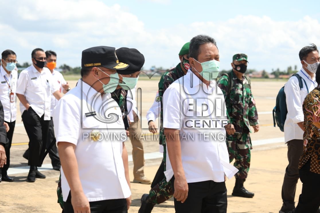 MMCKalteng - Palangka Raya - Gubernur Kalimantan Tengah (Kalteng) H. Sugianto Sabran beserta Anggota Forkopimda menyambut kedatangan Wakil Menteri Pertanahan Republik Indonesia (Wamenhan RI) Sakti Wahyu Trenggono, Wakil Menteri Lingkungan Hidup dan Kehutanan (LHK) RI Alue Dohong dan Wakil Menteri Badan Usaha Milik Negara (BUMN) RI Kartika Wirjoatmodjo di Bandar Udara (Bandara) Tjilik Riwut Palangka Raya dalam Rangka kunjungan kerja (Kunker) Wamenhan ke Kalteng, Rabu (01/07/2020).