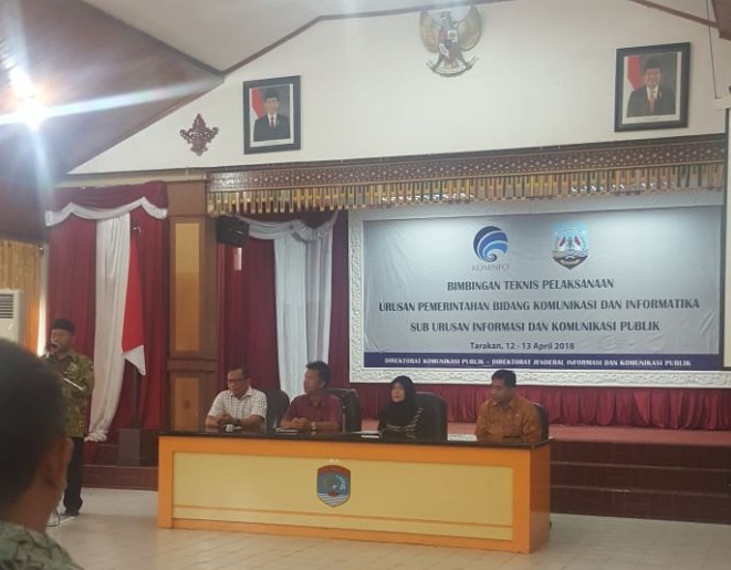 MMCKalteng - Diskominfo Kalteng turut hadir dalam Bimbingan Teknis Pelaksanaan Pemerintahan Bidang Komunikasi dan Informatika, Sub Urusan Informasi da Komunikasi Publik yang diselenggarakan oleh Kementerian Komunikasi dan Informatika RI di Ruang Serbaguna Lt.1 Kantor Walikota Tarakan, Jln. Kalimantan No.1 Tarakan, Kalimantan Utara (12/04/2018). Kegiatan ini berlangsung selama 2 hari dan diikuti oleh peserta yang berasal dari Diskominfo Kab/Kota dan Provinsi wilayah Kalimantan dan Sulawesi. Acara tersebut dimulai dengan diskusi panel dengan tema Arah kebijakan Pembangunan Daerah bidang Kominfo 2018 dengan narasumber dari Dir. Perencanaan Kemendagri, kemudian dilanjutkan dengan Implementasi Urusan Pemerintahan Bidang Komunikasi dan Informatika di daerah.