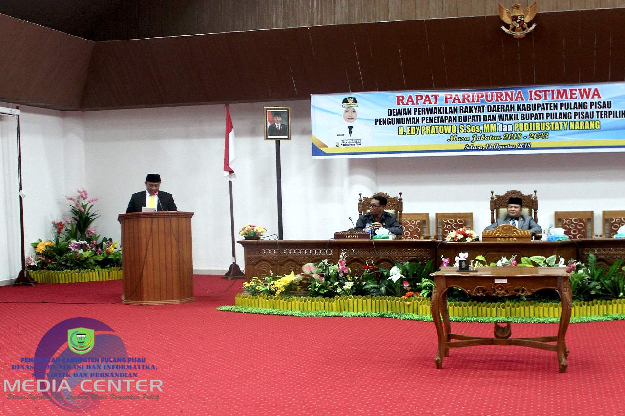 Bupati terpilih, Edy Pratowo dan Wakil Bupati Terpilih, Pudjirustaty Narang saat menghadiri Rapat Paripurna Istimewa Dewan Perwakilan Rakyat Daerah (DPRD) Kabupaten Pulang Pisau Pengumuman Penetapan Bupati dan Wakil Bupati Pulang Pisau Terpilih Periode 2018-2023 di ruang rapat paripurna istimewa DPRD Kabupaten Pulang Pisau, Selasa (14/8).