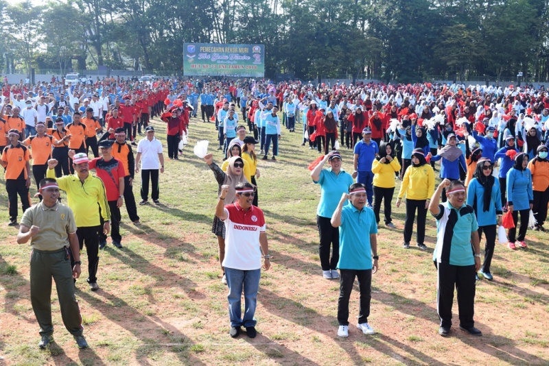 MMCKalteng - Pj Bupati Kapuas Agus Pramono, S.Sos didampingi PJ Ketua TP PKK Kabupaten Kapuas Andayani Agus Pramono, SE bersama dengan Ketua DPRD Kapuas, Unsur Forum Koordinasi Pimpinan Daerah Kapuas dan Sekretaris Daerah Kabupaten Kapuas Antusias Ikuti Tari Massal Gemu Famire dalam Rangka Peringatan HUT TNI Ke 73, di Lapangan Stadion Panunjung Tarung, Selasa (4/9) pagi.