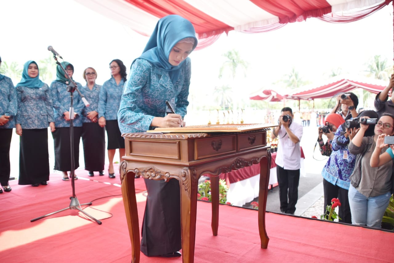 MMCKalteng – Tim Penggerak Pemberdayaan dan Kesejahteraan Keluarga (TP PKK) Provinsi Kalimantan Tengah gelar acara Jambore Kader PKK Tingkat Provinsi Kalimantan Tengah Tahun 2018 di halaman Istana Isen Mulang Rumah Jabatan Gubernur Kalimantan Tengah, Rabu (26/9). Acara ini dibuka secara resmi oleh Gubernur Kalimantan Tengah, H. Sugianto Sabran yang di tandai dengan pemukulan Katambung.
