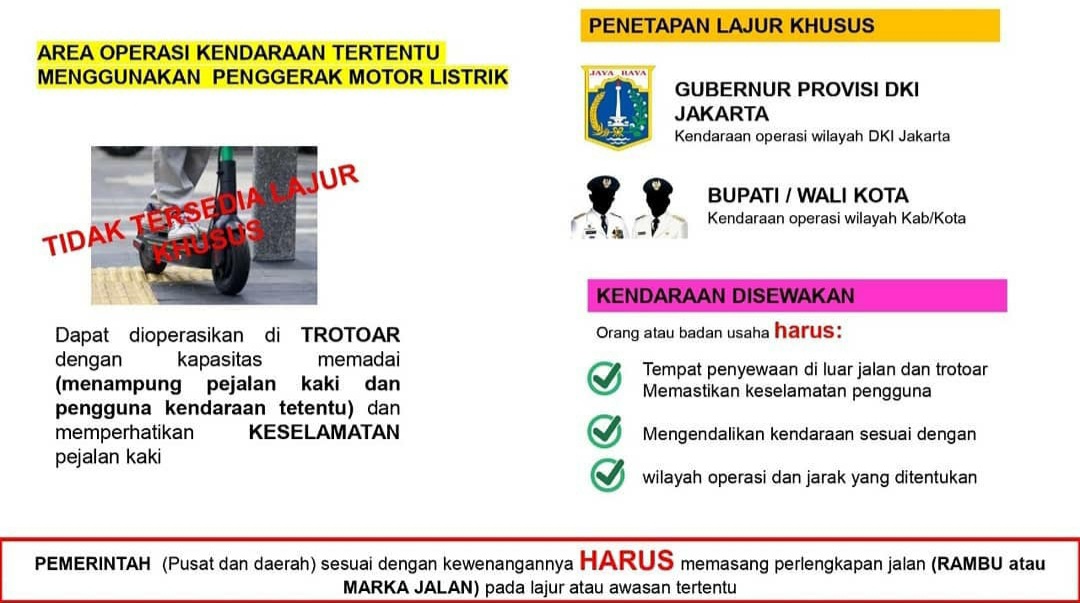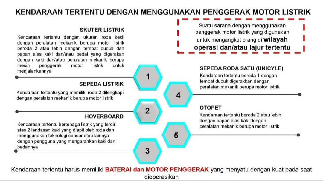 Beberapa ketentuan dalam penggunaan kendaraan berpenggerak motor listrik itu disebutkan lebih perinci lagi. Misal, untuk skuter listrik dan sepeda listrik kecepatan paling tinggi adalah 25 km per jam. Sedangkan, untuk hoverboard, unicycle, dan otopet kecepatan maksimal yang diperbolehkan adalah 6 km per jam.