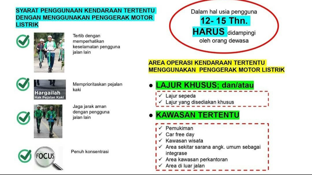 Selain itu, orang yang menggunakan kendaraan tertentu yang diatur dalam regulasi ini, harus memenuhi ketentuan menggunakan helm, usia paling rendah 12 tahun, hingga tidak diperbolehkan melakukan modifikasi daya motor yang dapat meningkatkan kecepatan.