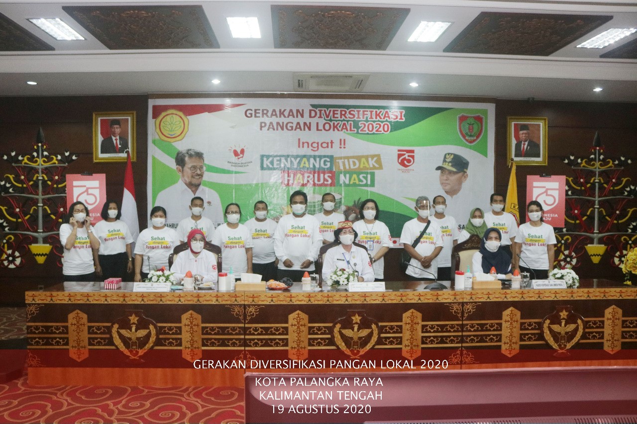 MMCKalteng - Palangka Raya - Rabu (19/8/2020) Badan Ketahanan Pangan Kementerian Pertanian bersama Pemerintah Provinsi Kalimantan Tengah dan Dinas Ketahanan Pangan Provinsi Kalimantan Tengah mengadakan kegiatan Gerakan Diversifikasi Pangan Lokal di Aula Eka Hapakat Kantor Gubernur Kalimantan Tengah. Kegiatan terbagi ke dalam 2 sesi acara; pada Sesi pertama dilaksanakan video conference antara Menteri Pertanian dengan Gubernur, Bupati, Walikota dan Kepala Dinas yang menangani Ketahanan Pangan Provinsi dan Kabupaten/Kota seluruh Indonesia. Sesi kedua video conference antara Gubernur Kalimantan Tengah dengan Bupati, Walikota, Kepala Dinas yang menangani Ketahanan Pangan, Lingkup Pertanian, Perikanan, Perdagangan dan Perindustrian, Koperasi dan UMKM Kabupaten/Kota se-Kalimantan Tengah.