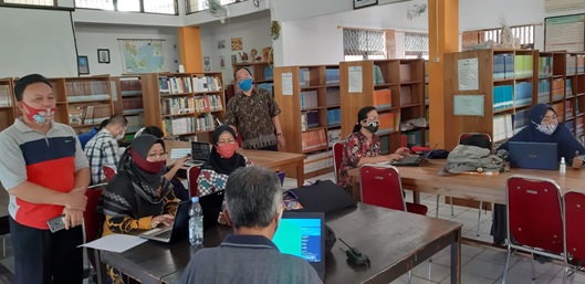3. Kelompok tiga tentang cara penggunaan aplikasi Learning Management System (LMS). Narasumbernya adalah Lilik Widiyanto, S. Pd., dan melakukan kegiatan di ruang perpustakaan sekolah.