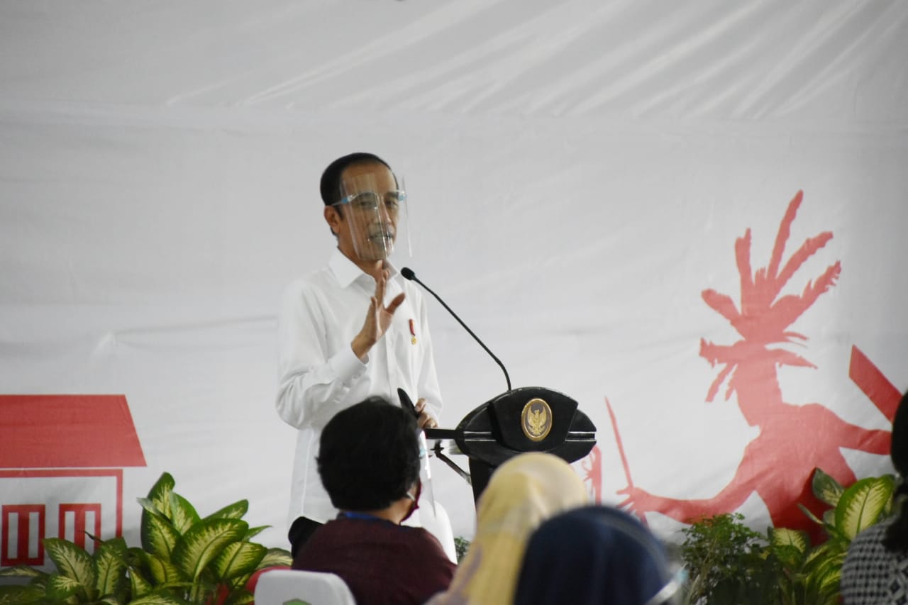 MMCKalteng – Pulang Pisau – Presiden Republik Indonesia (RI) Joko Widodo menyerahkan secara langsung bantuan Presiden (Banpres) bagi para pelaku Usaha Mikro Kecil dan Menengah (UMKM) se-Kalteng. Penyerahan bantuan berlangsung di Gedung Pertemuan Umum (GPU) Handep Hapakat Pulang Pisau, Kamis (08/10/2020), dan diikuti secara virtual jajaran pejabat utama Perbankan BRI dan BNI Kantor Utama dan Kantor Cabang area wilayah Kalteng-Kalsel.