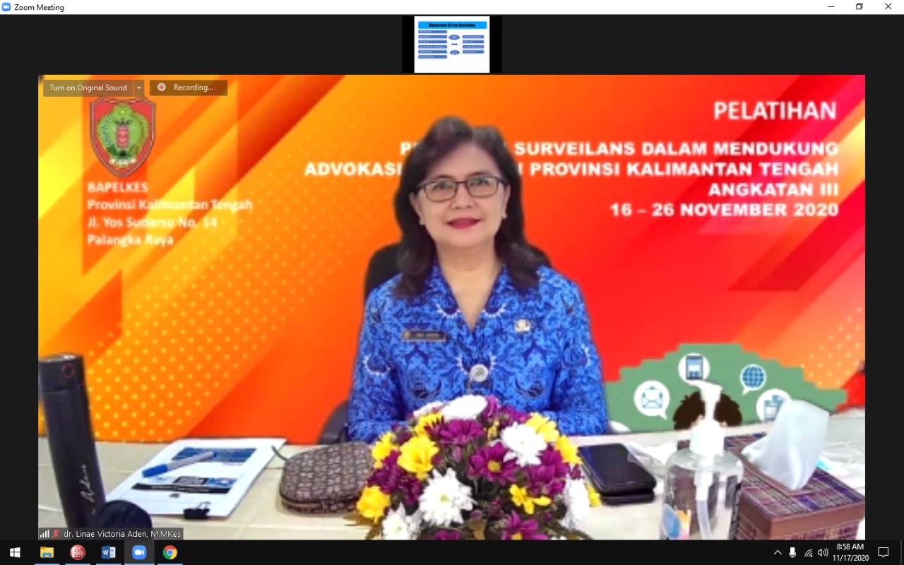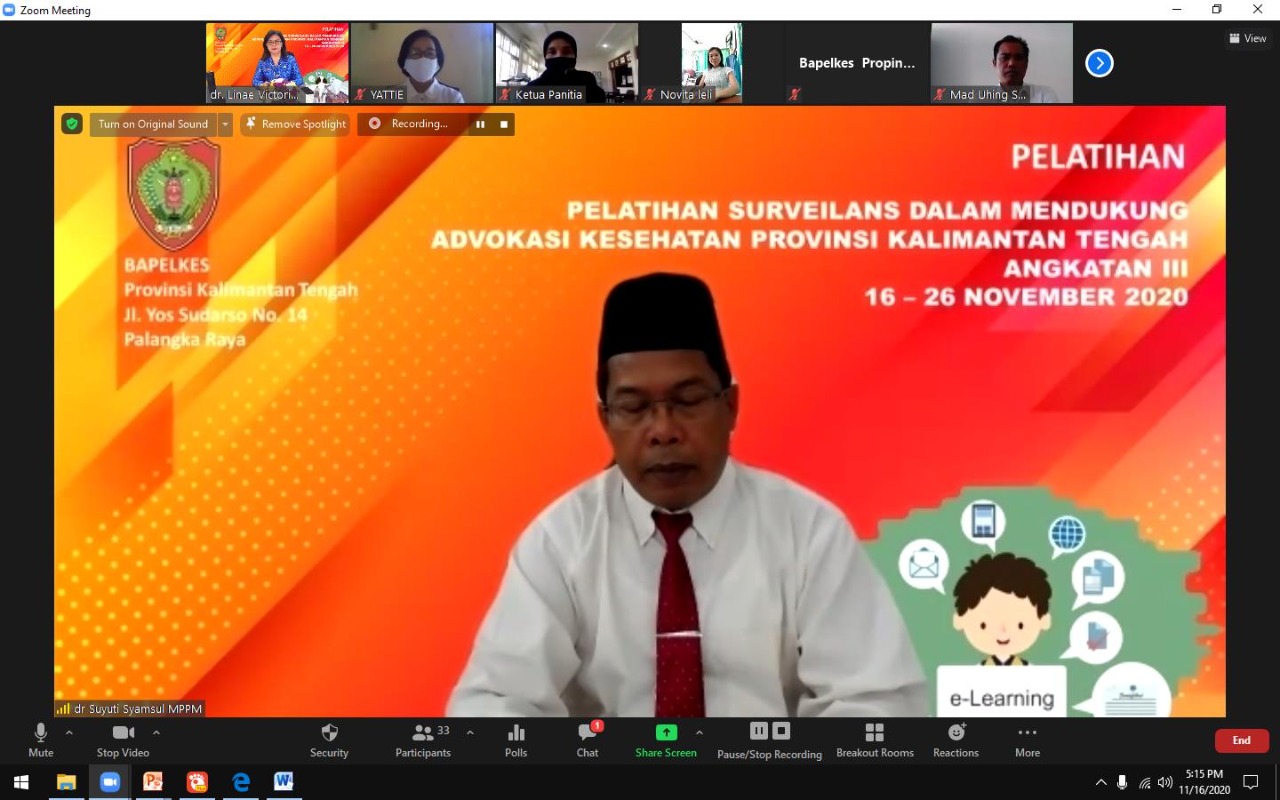 Pelatihan Surveilans dalam mendukung Advokasi Kesehatan adalah untuk memperkuat kemampuan para pengelola program kesehatan di Kabupaten/Kota dan Puskesmas dalam mempengaruhi pemangku kebijakan melalui komunikasi persuasif yang berbasis data kesehatan yang akurat melalui pendekatan surveilans. Hal itu disampaikan dr.Suyuti pada saat daring Zoom Meeting, Selasa (17/11/2020).