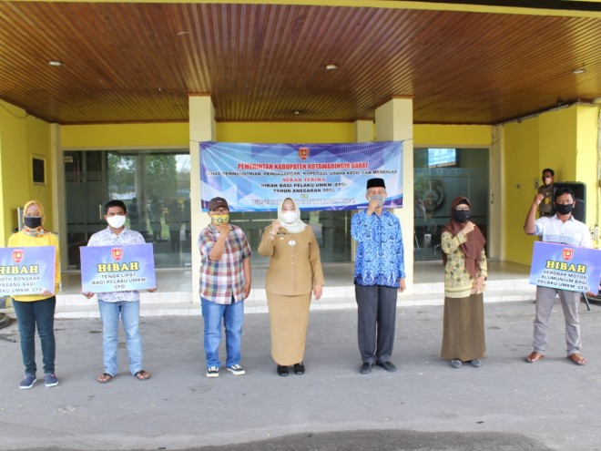 MMCKalteng - Kotawaringin Barat - Selasa (17/11/2020) Pemerintah Kabupaten Kotawaringin Barat (Kobar) melalui Dinas Perindustrian, Perdangangan, Koperasi, Usaha Kecil dan Menengah (Disperindagkop UKM) menyerahkan bantuan hibah bagi UMKM yang ada di CFD yang didanai dari APBD tahun 2020. Kegiatan ini dihadiri oleh Bupati Kobar, Lurah Baru, Lurah Raja, Lurah Mendawai dan pihak Kecamatan Arut Selatan serta beberapa orang perwakilan dari pelaku UMKM