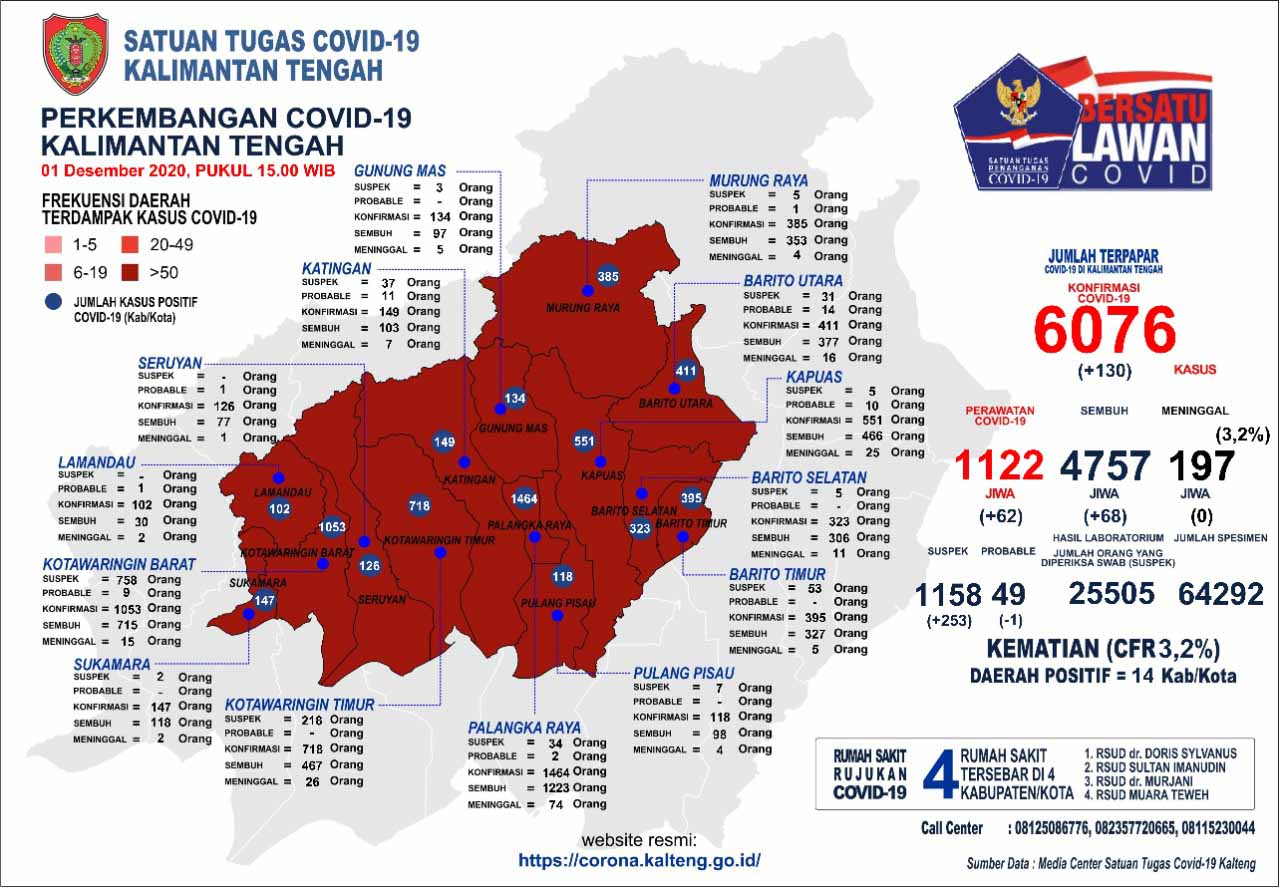 MMCKalteng - Palangka Raya – Satuan Tugas Percepatan Penanganan Covid-19 Provinsi Kalimantan Tengah (Prov. Kalteng) mengeluarkan data perkembangan terbaru kasus Covid-19 di Kalteng, Selasa (01/12/2020) Pukul 15.0 WIB. Berdasarkan data yang rilis oleh Media Center Satuan Tugas Percepatan Penanganan Covid-19 Kalteng, jumlah akumulasi data sampai dengan saat ini, pasien konfirmasi positif Covid-19 di Kalteng bertambah sebanyak 130 orang dengan total kasus mencapai 6.076 orang, pasien dinyatakan sembuh sebanyak 68 orang dan pasien dinyatakan meninggal dunia sebanyak 197 orang atau dengan tingkat kematian Case Fatality Rate (CFR) 3,2 persen.