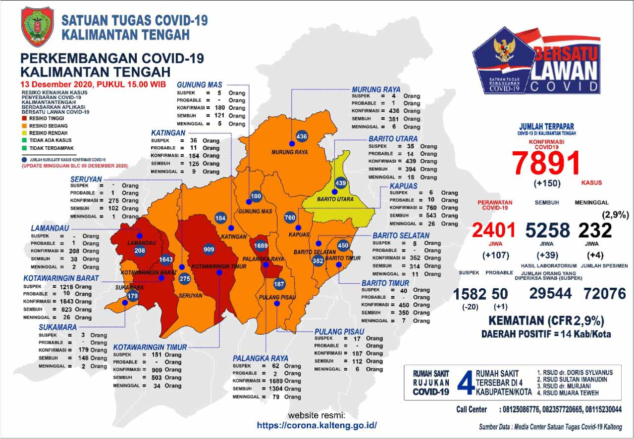 MMCKalteng - Palangka Raya – Satuan Tugas Percepatan Penanganan Covid-19 Provinsi Kalimantan Tengah (Prov. Kalteng) mengeluarkan data perkembangan terbaru kasus Covid-19 di Kalteng, Minggu (13/12/2020) Pukul 15.00 WIB. Berdasarkan data yang rilis oleh Media Center Satuan Tugas Percepatan Penanganan Covid-19 Kalteng, jumlah akumulasi data sampai dengan saat ini, pasien konfirmasi positif Covid-19 di Kalteng bertambah sebanyak 150 orang dengan total kasus mencapai 7.891 orang, pasien dinyatakan sembuh sebanyak 39 orang dan pasien dinyatakan meninggal dunia sebanyak 232 orang atau dengan tingkat kematian Case Fatality Rate (CFR) 2,9 persen.
