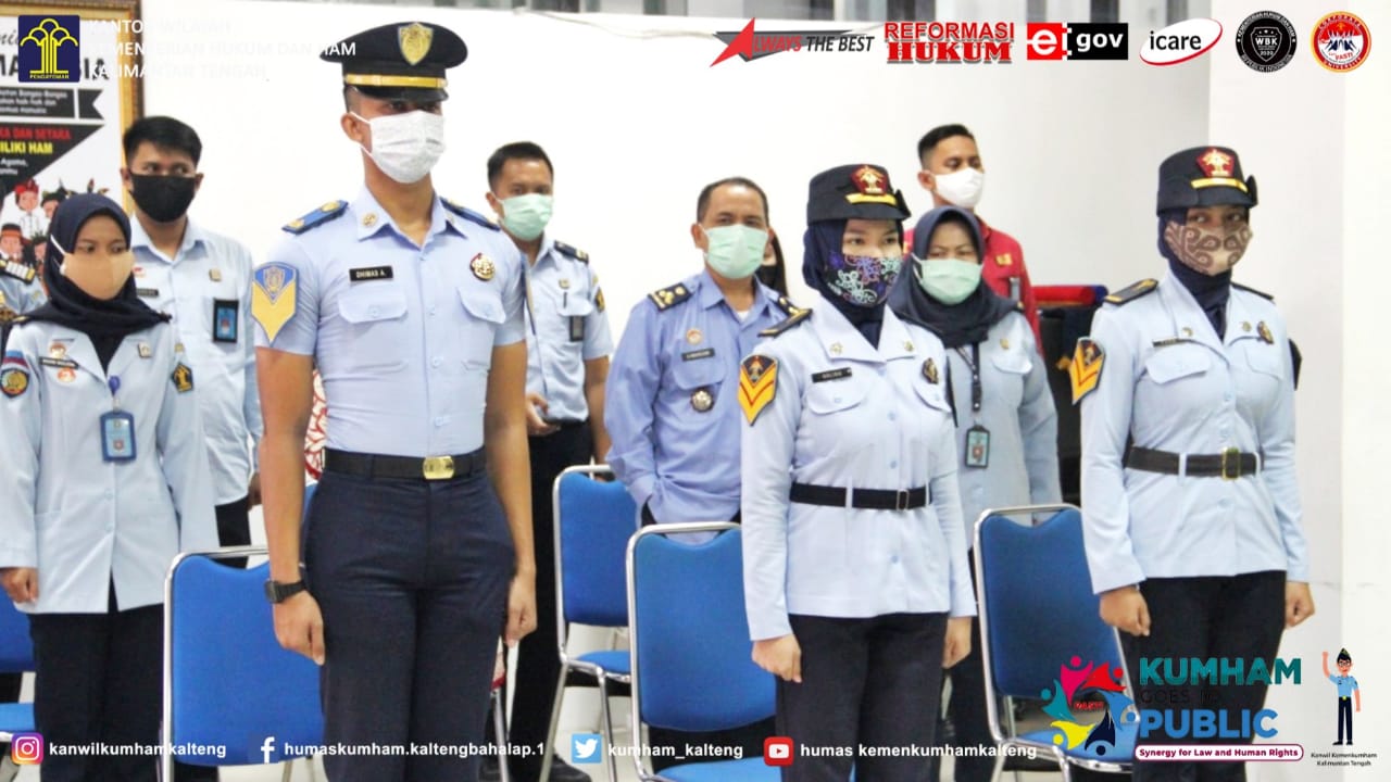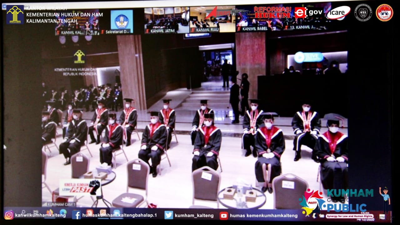 MMCKalteng - Palangka Raya - Kepala Kantor Wilayah Kementerian Hukum dan HAM Kalimantan Tengah Ilham Djaya didampingi Kepala Bidang Pembinaan, Bimbingan dan Teknologi Informasi I Putu Murdiana dan Kepala Bidang Intelijen, Penindakan, Informasi Dan Sarana Komunikasi Junaedi menghadiri Wisuda Program Diploma IV POLTEKIP dan POLTEKIM Secara Virtual melalui aplikasi Zoom yang terpusat pada Aula Graha Pengayoman Sekretariat Jenderal Kemenkumham RI, Senin (14/12/2020). Kegiatan ini dibuka secara langsung oleh Ketua Senat Dewan Dosen Politeknik Ilmu Pemasyarakatan Adi Soejatno.