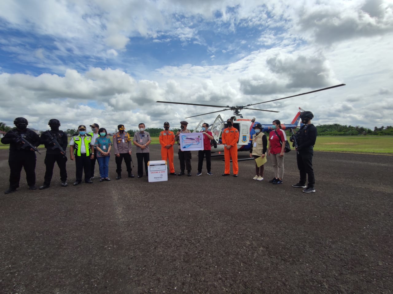 MMCKalteng - Gunung Mas - Personel Polres Gunung Mas (Gumas), jajaran Polda Kalteng melakukan pengamanan kedatangan Vaksin Covid-19 Sinovac tahap pertama yang didistribusikan melalui jalur udara, Sabtu (9/1/2021) pukul 10.00 WIB. Distribusi vaksin Covid-19 jenis Sinovac ini menggunakan Helikopter dengan jalur pendistribusian Kabupaten Gumas dan Kabupaten Murung Raya.