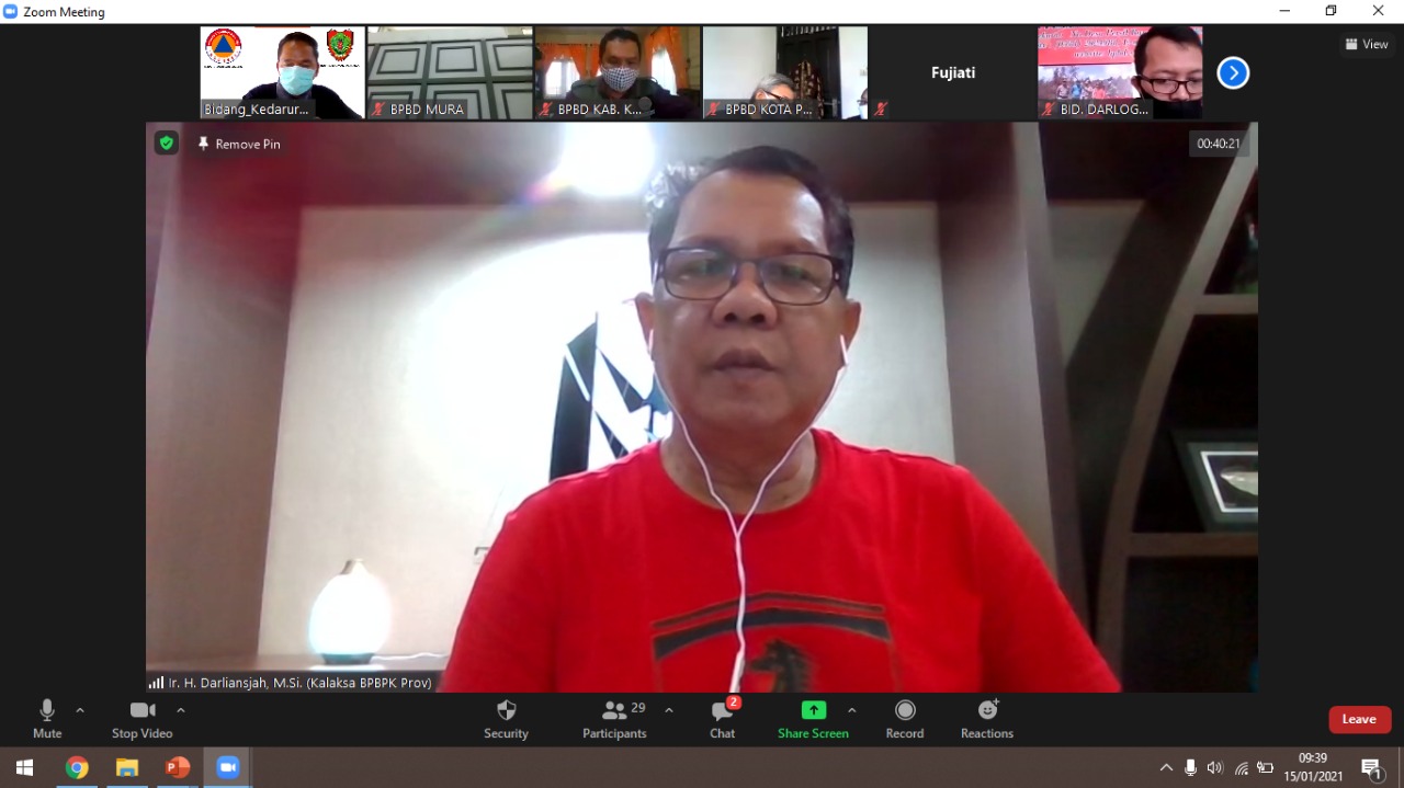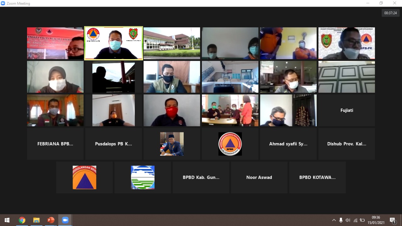 MMCKalteng - Palangka Raya – Badan Penanggulangan Bencana dan Pemadam Kebakaran Provinsi Kalimantan Tengah menggelar Acara Rapat Koordinasi Kesiapan Menghadapi Ancaman/Bahaya Banjir, Banjir Bandang, Cuaca Ekstrem dan Tanah Longsor Tahun 2021. Rapat dilaksanakan secara virtual menggunakan Zoom Meeting, Jum`at (15/1/2021), dihadiri oleh BPBD Kabupaten dan Kota se-Kalimantan Tengah.