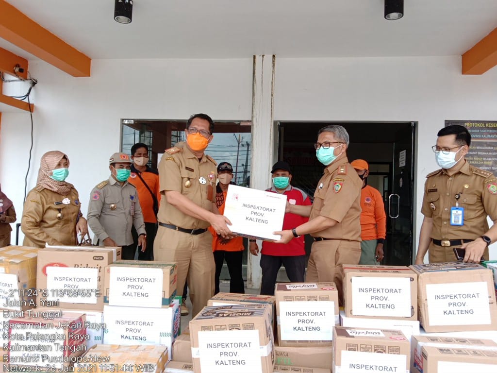 Penyerahan bantuan dari Inspektorat Provinsi Kalimantan Tengah tersebut dikoordinir oleh Badan Penanggulangan Bencana dan Pemadam Kebakaran (BPBPK) Provinsi Kalimantan Tengah untuk disalurkan ke masyarakat Provinsi Kalimantan Selatan bertempat di halaman Pusdalops BPBPK Provinsi Kalimantan Tengah, Selasa (26/1/2021).