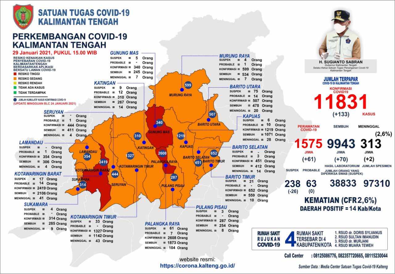 MMCKalteng - Palangka Raya – Satuan Tugas Percepatan Penanganan Covid-19 Provinsi Kalimantan Tengah (Prov. Kalteng) mengeluarkan data perkembangan terbaru kasus Covid-19 di Kalteng, Jumat (29/01/2021) Pukul 15.00 WIB. Berdasarkan data yang rilis oleh Media Center Satuan Tugas Percepatan Penanganan Covid-19 Kalteng, jumlah akumulasi data sampai dengan saat ini, pasien konfirmasi positif Covid-19 di Kalteng bertambah sebanyak 133 orang dengan total kasus mencapai 11.831 orang, pasien dinyatakan sembuh sebanyak 70 orang dan pasien dinyatakan meninggal dunia sebanyak 313 orang atau dengan tingkat kematian Case Fatality Rate (CFR) 2,6 persen.