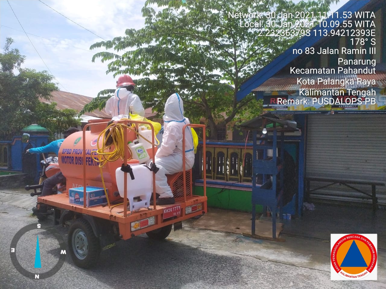 Ketua Pelaksana Harian Satuan Tugas Penanganan (Satgas) Covid-19 Provinsi Kalimantan Tengah Ir. H. Darliansjah, M.Si melalui Koordinator Bidang Perubahan Perilaku Kibue mengatakan, upaya pencegahan terjadinya penyebaran dan penularan Covid-19 di lingkungan masyarakat yaitu dengan melakukan penyemprotan cairan disinfektan sterilisasi dan disinfeksi. Penyemprotan dilakukan sehubungan adanya dari beberapa warga di Kelurahan Panarung, Kecamatan Pahandut, Kota Palangka Raya, berdasarkan dari hasil tes swab PCR terkonfirmasi positif Covid-19.