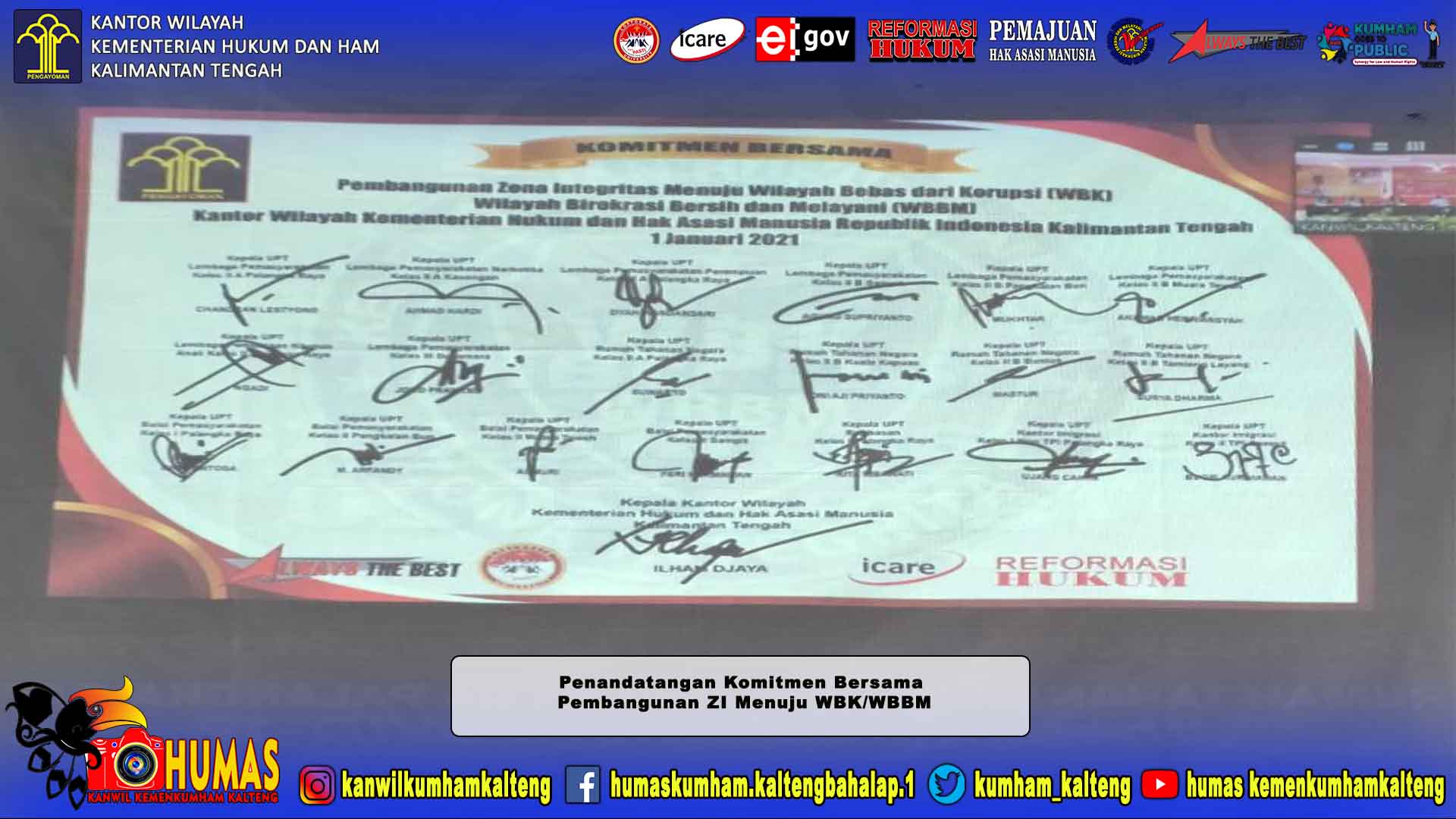 MMCKalteng - Palangka Raya - Kepala Balai Pemasyarakatan Kelas II Pangkalan Bun M.Arfandy menghadiri Deklarasi Janji Kinerja dan Penandatangan Komitmen Bersama Pembangunan Zona Integritas menuju WBK/WBBM beserta seluruh Unit Pelaksan Teknis (UPT) Pemasyarakatan dan Imigrasi Kantor Wilayah Kalimantan Tengah bertempat di Aula besar lantai II, Senin (1/2/2021). Hadir pula Kepala Kantor Wilayah Kementerian Hukum dan HAM Kalimantan Tengah Ilham Djaya beserta unsur Forum Koordinasi Pimpinan Daerah (FORKOPIMDA) dan perwakilan Ombudsman RI Kalimantan Tengah.