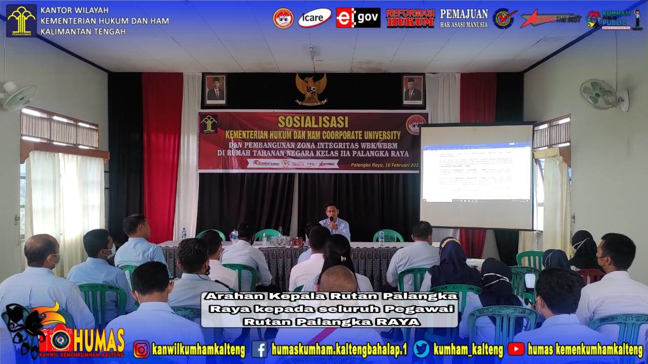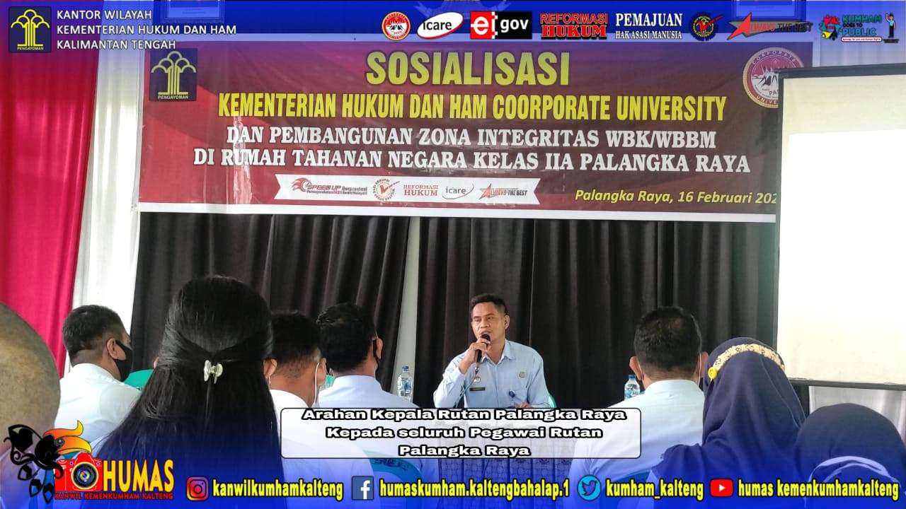 MMCKalteng - Palangka Raya - Rumah Tahanan Negara Kelas IIA Palangka Raya, hari ini Selasa (16/2/2021) melaksanakan program Internalisasi Corporate University di Rumah Tahanan Negara Kelas IIA Palangka Raya, bertempat di Aula Rutan Palangka Raya. Kegiatan ini sebagai tindak lanjut dari sosialisasi Kumham Corporate University yang sebelumnya dilakukan oleh Kakanwil Kemenkumham Kalteng Ilham Djaya. Kepala Rumah Tahanan Negara Kelas IIA Palangka Raya mengadakan internalisasi terkait Corporate University kepada seluruh pegawai Rutan Palangka Raya, baik Pejabat Struktural, pegawai PNS maupun CPNS.