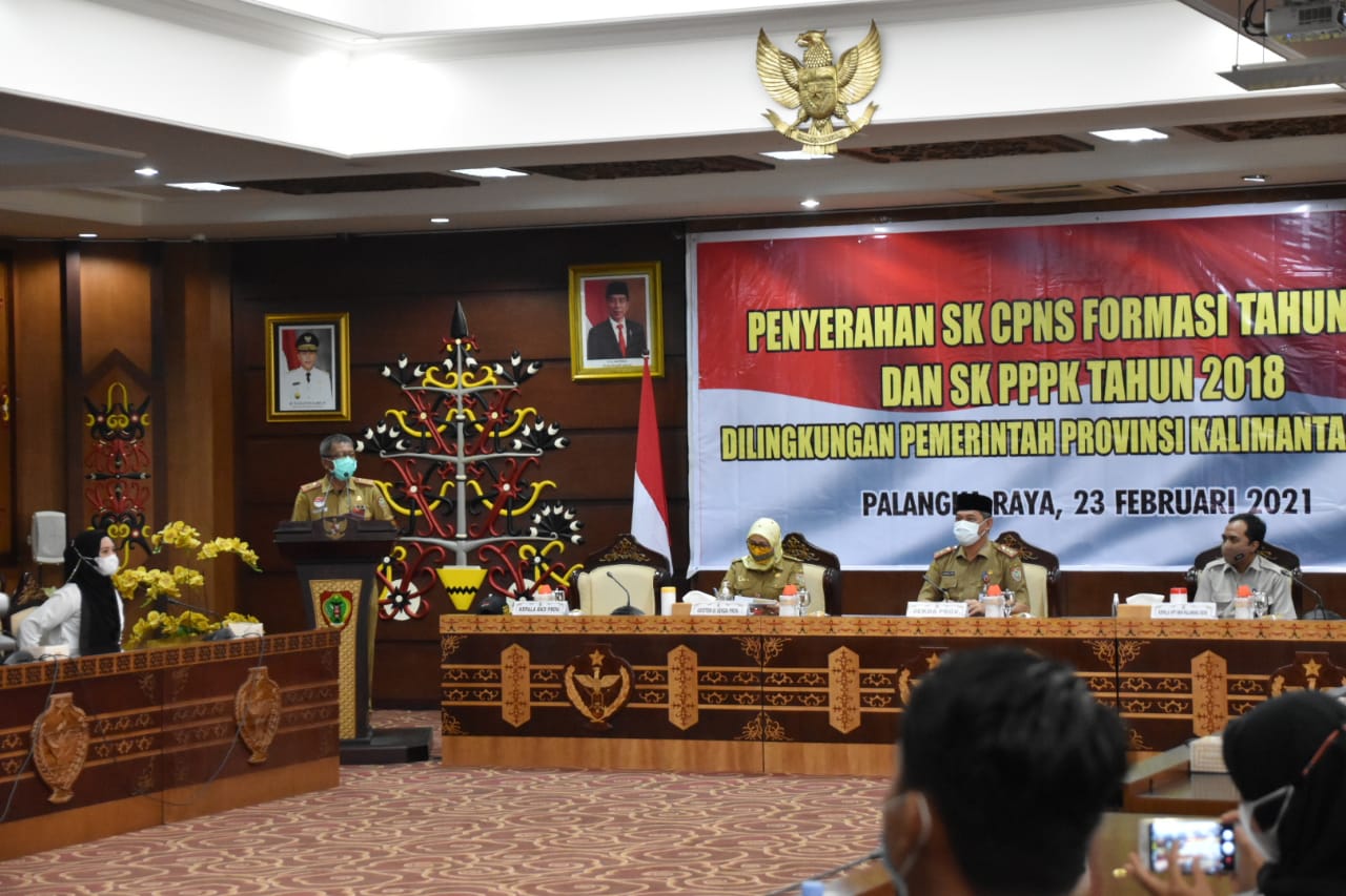 MMCKalteng – Palangka Raya – Sekretaris Daerah Provinsi Kalimantan Tengah (Prov. Kalteng) Fahrizal Fitri mewakili Gubernur Kalteng H. Sugianto Sabran melakukan Penyerahan Surat keputusan (SK) Gubernur tentang Pengangkatan Calon Pegawai Negeri Sipil (CPNS) Tahun 2019/2020 dan Pegawai Pemerintah dengan Perjanjian Kerja (PPPK) Tahun 2018 di lingkungan Pemerintah Prov. Kalteng, bertempat di Aula Eka Hapakat, Kantor Gubernur Kalteng, Selasa (23/02/2021). Penyerahan SK diikuti oleh perwakilan CPNS dan PPPK secara langsung ditempat acara dan secara virtual dari tempat masing-masing.