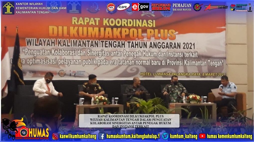MMCKalteng - Palangka Raya - Kelapa Lembaga Pemasyarakatan Kelas IIB Sampit mengikuti Rapat Koordinasi dengan Pengadilan, Kementerian Hukum dan HAM, Kejaksaan dan Kepolisian (Dilkumjakpol) se-wilayah hukum Kalimantan Tengah di ballroom hotel luwansa Palangka Raya, Senin (8/3/2021). Dasar dari kegiatan ini adalah Surat Kepala Divisi Pemasyarakatan Kantor Wilayah Kementerian Hukum dan HAM Kalimantan Tengah Nomor : W.17.UM.01.01-501 tentang Pemanggilan Peserta Rapat Dilkumjakpol dengan tema Penguatan Kolaborasi dan Sinergitas antar Penegak Hukum dan Instansi Terkait Sebagai Upaya Optimalisasi Pelayanan Publik Pada Era Tatanan Normal Baru di Provinsi Kalimantan Tengah.