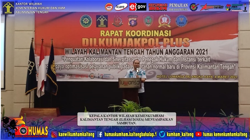 Kepala Kantor Wilayah Kemenkumham Kalimantan Tengah Ilham Djaya dalam sambutannya menyampaikan, "Terima kasih atas terlaksananya Dilkumjakpol Plus ini, semoga kolaborasi dan sinergitas ini dapat mengoptimalkan layanan publik serta mampu mendukung berbagai permasalahan yang timbul di Pemasyarakatan (Overcrowding)," tuturnya.