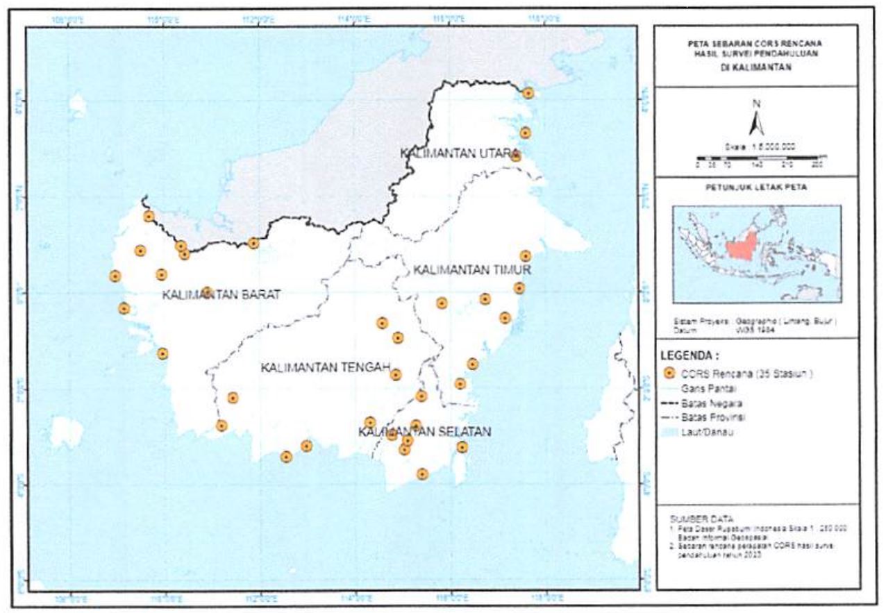 Pada pelaksanaan kegiatan tahun anggaran 2021, lokasi penempatan InaCORS guna mendukung Sistem Referensi Geospasial Nasional adalah di Pulau Kalimantan dengan total 35 stasiun. Untuk Provinsi Kalimantan Tengah ada 8 (delapan) lokasi penempatan pilar dan instalasi perangkat stasiun InaCORS. Ada 5 (lima) lokasi yang sudah terbangun dan terpasang yaitu di Kabupaten Pulang Pisau, Barito Selatan, Seruyan, Kotawaringin Timur, dan Barito Utara, sedangkan 3 (tiga) lokasi yang masih dalam tahapan/proses pembangunan yaitu di Kabupaten Murung Raya, Sukamara, dan Lamandau.