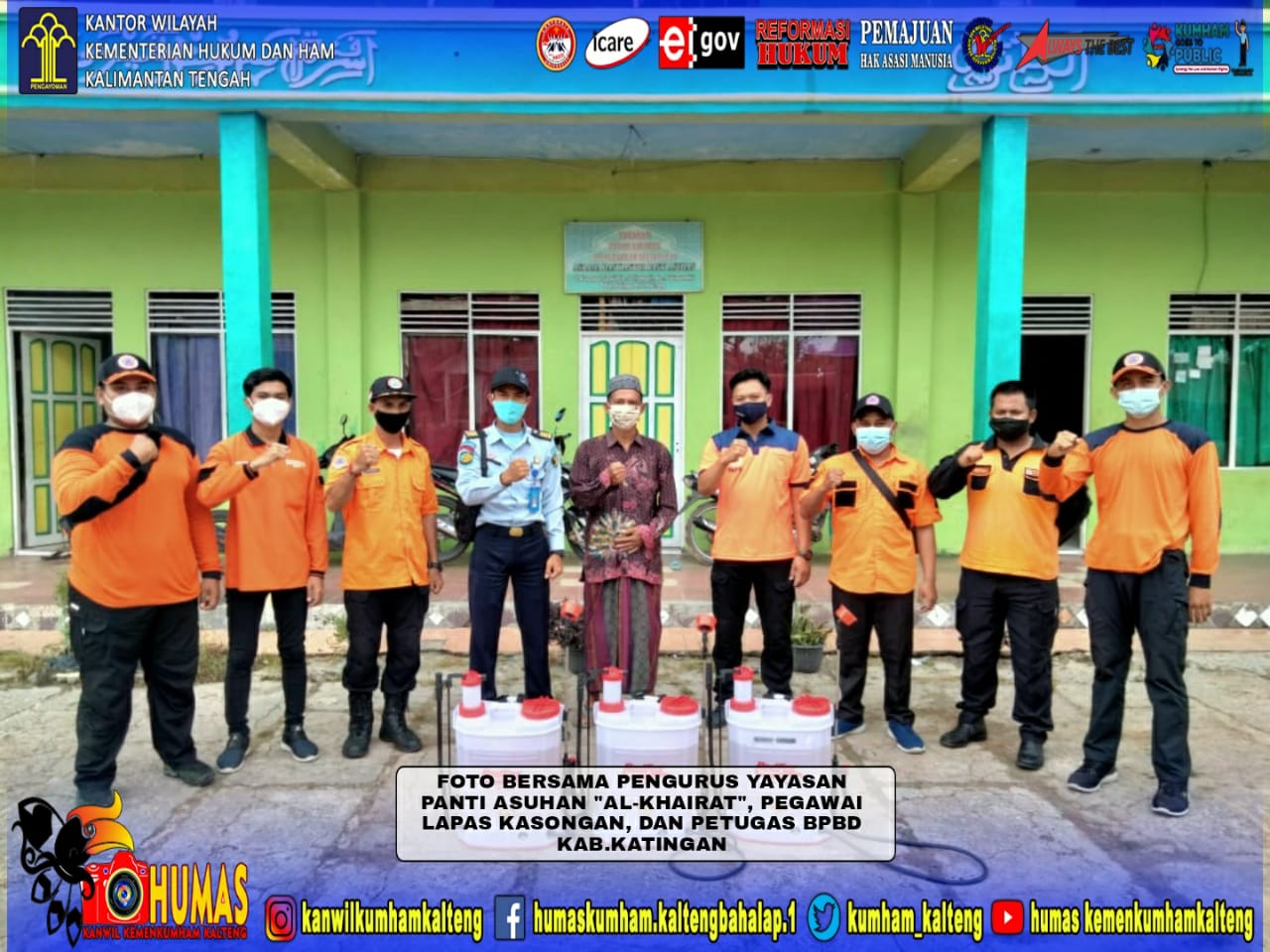 MMCKalteng - Katingan – Lembaga Pemasyarakatan Narkotika Kelas IIA Kasongan berkolaborasi dengan BPBD (Badan Penanggulangan Bencana Daerah) Kabupaten Katingan untuk mensukseskan Kegiatan Bakti Sosial di Yayasan Panti Asuhan Al-Khairat, Senin (29/3/2021). Kolaborasi tersebut dalam rangka Penerapan Protokol Kesehatan pada fasilitas umum berupa penyemprotan cairan disinfektan di Yayasan Panti Asuhan Al-Khairat.
