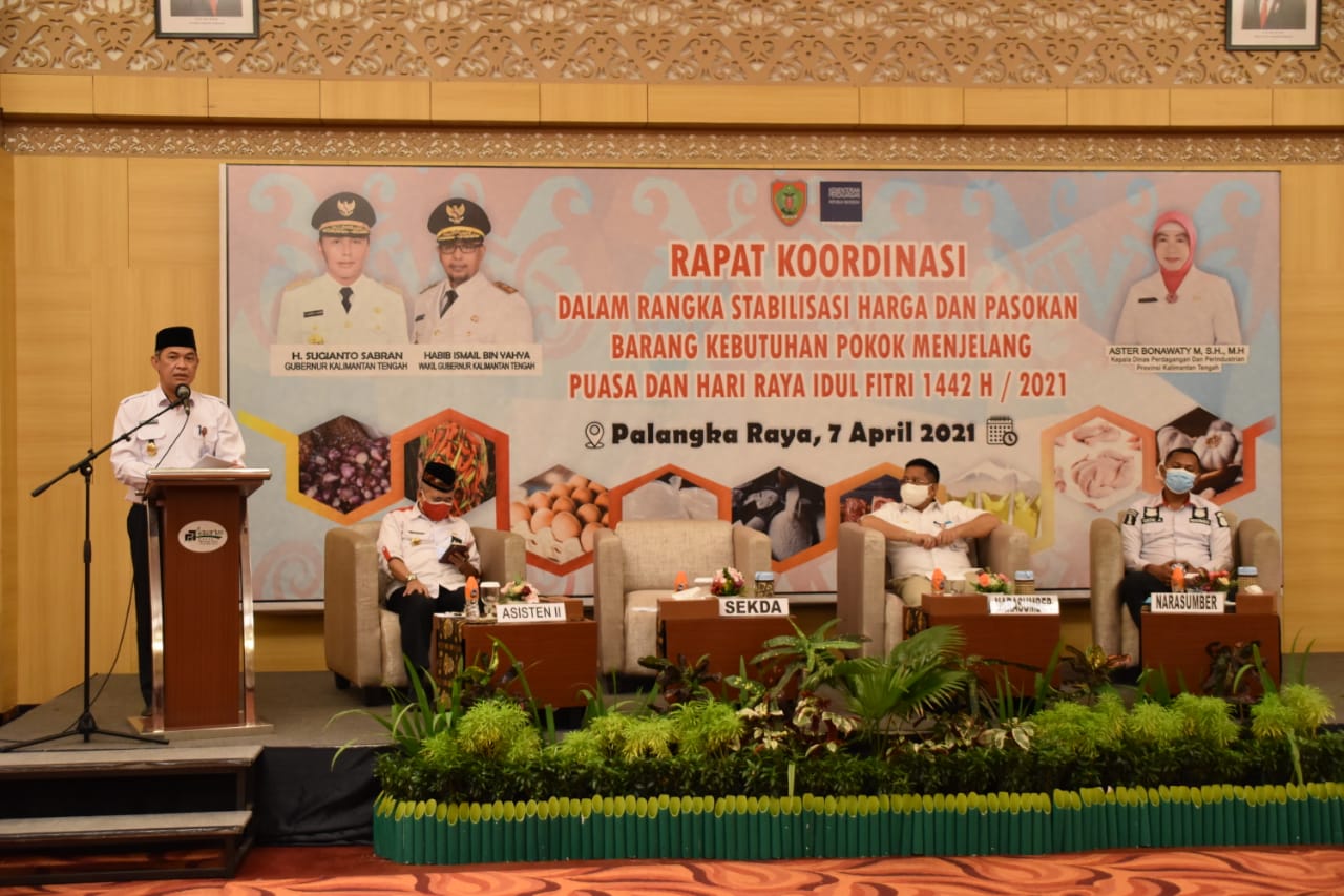 MMCKalteng – Palangka Raya – Sekretaris Daerah Provinsi Kalimantan Tengah (Prov. Kalteng) Fahrizal Fitri mewakili Gubernur Kalteng H. Sugianto Sabran membuka secara langsung Rapat Koordinasi (Rakor) Stabilitas Harga dan Stok/Pasokan Barang Kebutuhan Pokok menjelang Puasa dan Hari Raya Idul Fitri 1442 H/ 2021 M di Kalteng, bertempat di Hotel Aquarius, Palangka Raya, Rabu (7/4/2021). Rakor ini digelar guna menindaklanjuti arahan Menteri Perdagangan Republik Indonesia (RI) pada acara Rapat Koordinasi dalam rangka menjaga stabilitas harga dan ketersediaan pasokan barang kebutuhan pokok masyarakat menghadapi Puasa dan Hari Raya Idul Fitri 1442 H/ 2021 M yang dilaksanakaan pada tanggal 8 Maret 2021 secara virtual yang dipimpin oleh Menteri Perdagangan.