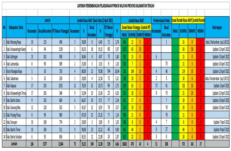 Koordinator Bidang Penegakan Hukum dan Pendisiplinan Bidang Kesehatan Satuan Tugas Penanganan Covid-19 Prov. Kalteng Erlin Hardi, ST menyampaikan, “Adapun rinciannya, Kabupaten Murung Raya berjumlah 1 Posko, Kabupaten Lamandau berjumlah 75 Posko, Kota Palangka Raya berjumlah 48 Posko, Kabupaten Sukamara berjumlah 5 Posko, Kabupaten Kapuas berjumlah 41 Posko, Kabupaten Kotawaringin Timur berjumlah 15 Posko, Kabupaten Barito Utara berjumlah 1 Posko, Kabupaten Gunung Mas berjumlah 16 Posko, Kabupaten Pulang Pisau berjumlah 16 Posko, Kabupaten Seruyan berjumlah 7 Posko, Kabupaten Barito Timur berjumlah 37 Posko, Kabupaten Barito Selatan berjumlah 6 Posko,” ucapnya, Rabu (14/4/2021).