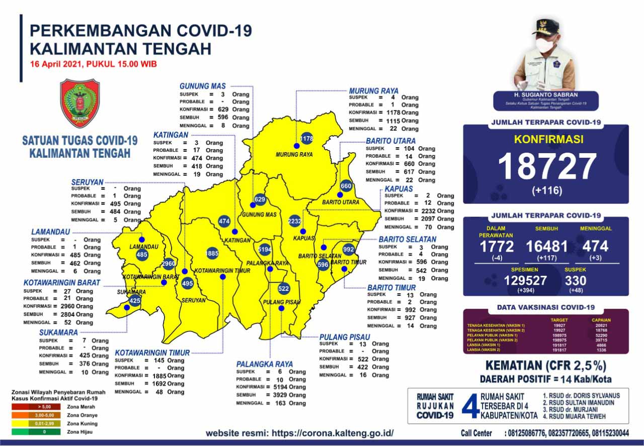 MMCKalteng - Palangka Raya – Satuan Tugas Percepatan Penanganan Covid-19 Provinsi Kalimantan Tengah (Prov. Kalteng) mengeluarkan data perkembangan terbaru kasus Covid-19 di Kalteng, Jumat (16/4/2021) Pukul 15.00 WIB. Berdasarkan data yang rilis oleh Media Center Satuan Tugas Percepatan Penanganan Covid-19 Kalteng, jumlah akumulasi data sampai dengan saat ini, pasien konfirmasi positif Covid-19 di Kalteng bertambah sebanyak 116 orang dengan total kasus mencapai 18.727 orang, pasien dinyatakan sembuh sebanyak 117 orang dan pasien dinyatakan meninggal dunia sebanyak 474 orang atau dengan tingkat kematian Case Fatality Rate (CFR) 2,5 persen.