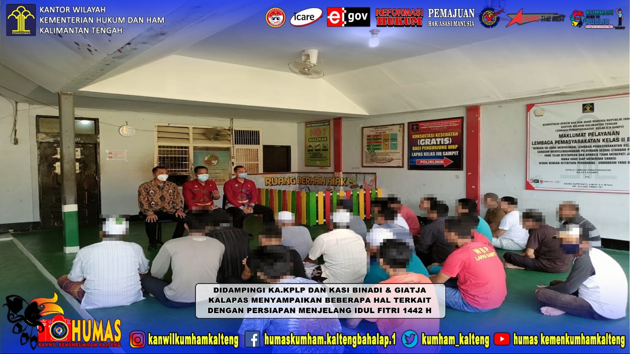 MMCKalteng - Kotawaringin Timur - Bertempat di ruang serba guna Kepala Lembaga Pemasyarakatan Kelas IIB Sampit bertatap muka dengan masing-masing Kepala kamar hunian (perwakilan) Warga Binaan Pemasyarakatan (WBP), Jumat (30/4/2021). Dalam kesempatan kali ini Kalapas didampingi oleh Kepala Kesatuan Pengamanan serta Kepala Seksi Pembinaan Narapidana/Anak Didik dan Kegiatan Kerja dengan agenda menyampaikan beberapa hal keterkaitan dengan persiapan menjelang datangnya Idul Fitri 1442 H/2021 M dalam masa pandemi covid-19 ini.