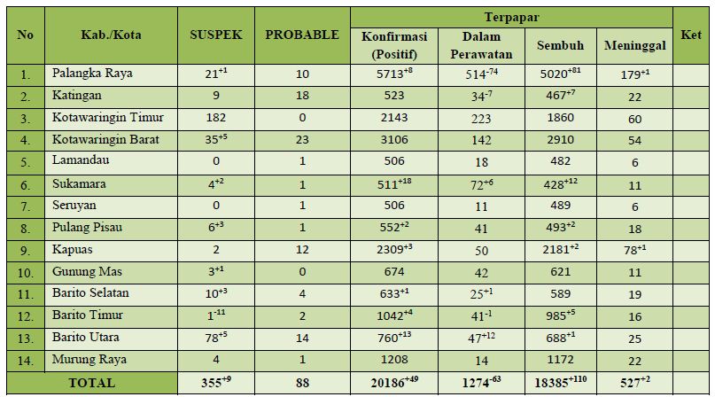 Koordinator Bidang Penegakan Hukum dan Pendisiplinan Bidang Kesehatan Satgas Penanganan Covid-19 Prov. Kalteng Erlin Hardi, ST menyampaikan, ”Secara keseluruhan Prov. Kalteng sampai saat ini, total terkonfirmasi mencapai 20.186, sedangkan dalam perawatan mencapai 1.274, sedangkan sembuh mencapai 18.385 dan meninggal mencapai 527 orang,” ucapnya.