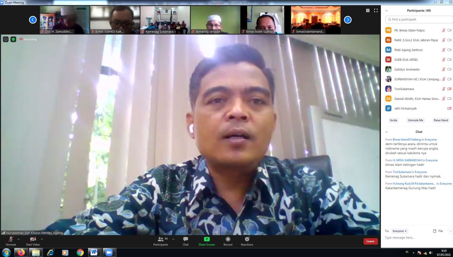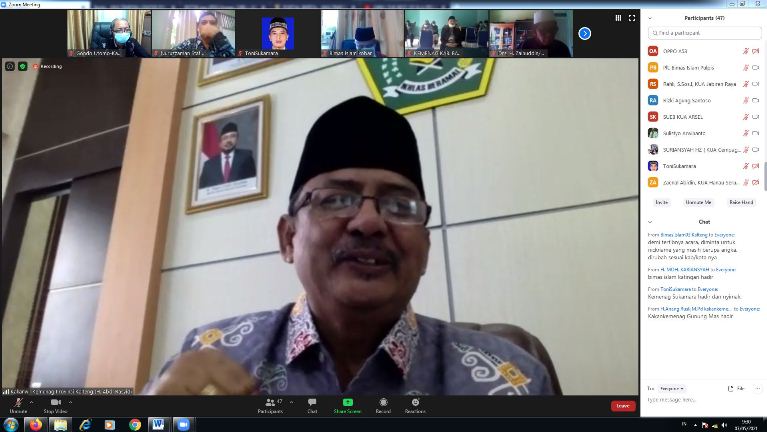 MMCKalteng - Palangka Raya – Kantor Wilayah Kementerian Agama Provinsi Kalimantan Tengah menggelar rapat koordinasi bersama 2 staf khusus (Stafsus) Menteri Agama (Menag) RI. Rapat diselenggarakan secara daring selama 2 hari berturut-turut, pada 6-7 Mei 2021. Pada Kamis (6/5/2021), rapat koordinasi dihadiri oleh Stafsus Ishfah Abdil Aziz. Sedangkan pada Jumat (7/5/2021), Stafsus yang hadir adalah Nuruzzaman.
