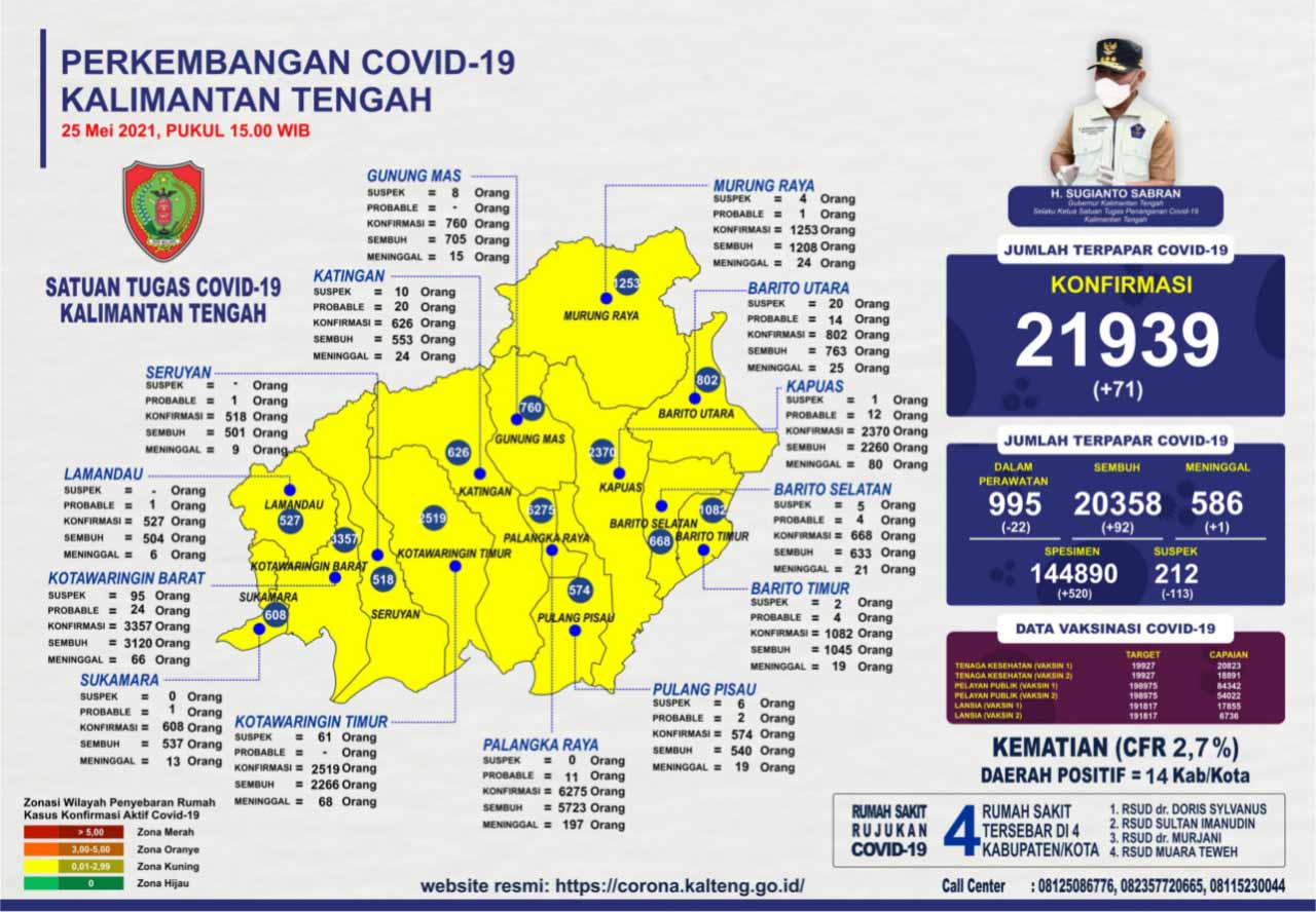 MMCKalteng - Palangka Raya – Satuan Tugas Percepatan Penanganan Covid-19 Provinsi Kalimantan Tengah (Prov. Kalteng) mengeluarkan data perkembangan terbaru kasus Covid-19 di Kalteng, Selasa (25/5/2021) Pukul 15.00 WIB. Berdasarkan data yang rilis oleh Media Center Satuan Tugas Percepatan Penanganan Covid-19 Kalteng, jumlah akumulasi data sampai dengan saat ini, pasien konfirmasi positif Covid-19 di Kalteng bertambah sebanyak 71 orang dengan total kasus mencapai 21.939 orang, pasien dinyatakan sembuh sebanyak 92 orang dan pasien dinyatakan meninggal dunia sebanyak 586 orang atau dengan tingkat kematian Case Fatality Rate (CFR) 2,7 persen.
