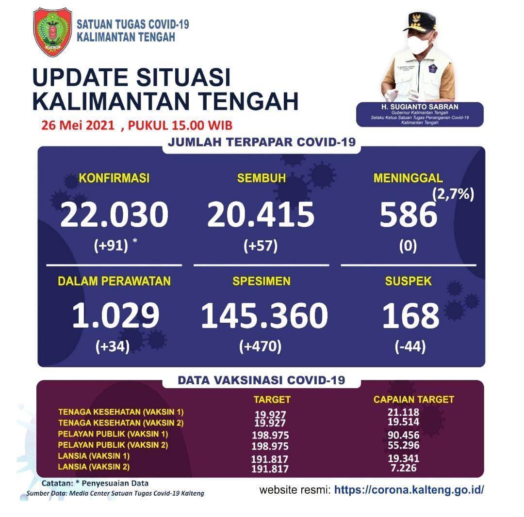 MMCKalteng – Palangka Raya – Perkembangan penanganan pandemi Corona Virus Disease 2019 (Covid-19) sampai dengan Rabu (26/5/2021) Pukul 15.00 WIB kemarin, jumlah pasien konfirmasi positif Covid-19 di Kalteng bertambah sebanyak 91 orang konfirmasi baru, 28 orang diantaranya merupakan warga asal Kota Palangka Raya, 3 orang merupakan warga asal Kabupaten Katingan, 30 orang merupakan warga asal Kabupaten Kotawaringin Timur, 19 orang merupakan warga asal Kabupaten Kotawaringin Barat, 3 orang merupakan warga asal Kabupaten Sukamara, 5 orang merupakan warga asal Kabupaten Pulang Pisau dan 3 orang merupakan warga asal Kabupaten Murung Raya.