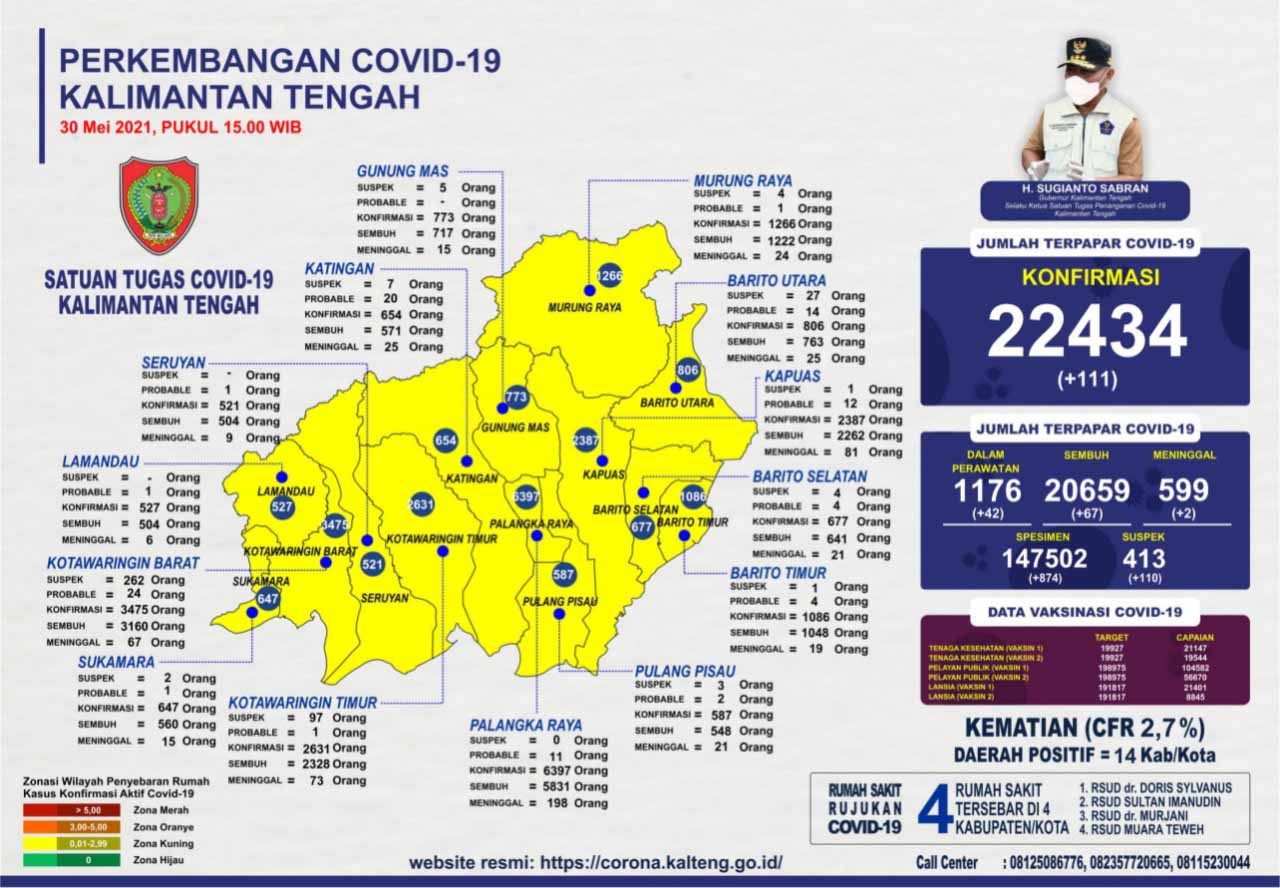 MMCKalteng - Satuan Tugas Percepatan Penanganan Covid-19 Provinsi Kalimantan Tengah (Prov. Kalteng) mengeluarkan data perkembangan terbaru kasus Covid-19 di Kalteng, Minggu (30/5/2021) Pukul 15.00 WIB. Berdasarkan data yang rilis oleh Media Center Satuan Tugas Percepatan Penanganan Covid-19 Kalteng, jumlah akumulasi data sampai dengan saat ini, pasien konfirmasi positif Covid-19 di Kalteng bertambah sebanyak 111 orang dengan total kasus mencapai 22.434 orang, pasien dinyatakan sembuh sebanyak 67 orang dan pasien dinyatakan meninggal dunia sebanyak 599 orang atau dengan tingkat kematian Case Fatality Rate (CFR) 2,7 persen.