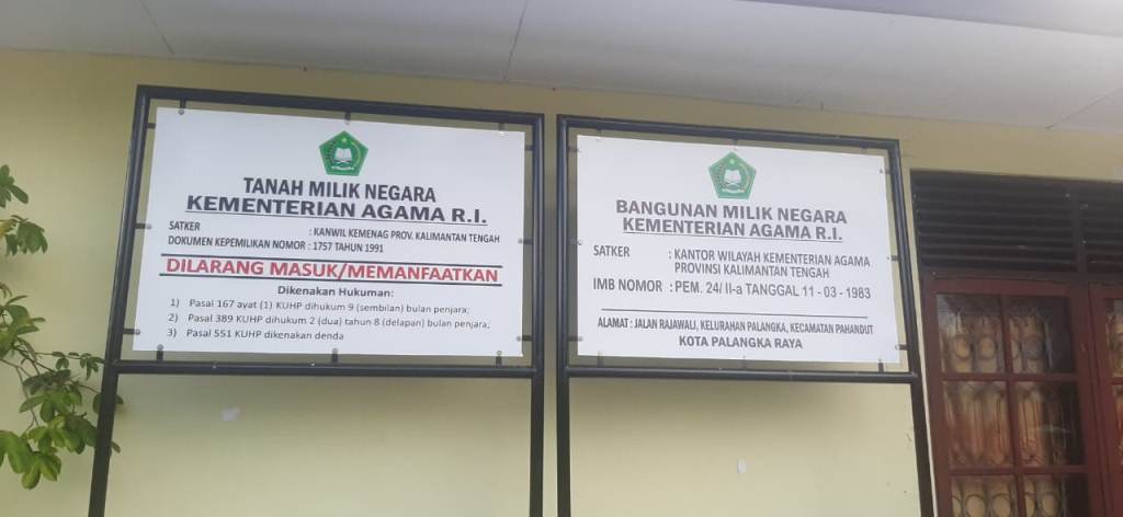 KMA tersebut memerintahkan kepada seluruh satuan kerja Kemenag di semua tingkatan untuk melakukan langkah pengamanan aset Barang Milik Negara (BMN). Kanwil Kemenag Kalimantan Tengah mengimplementasikan hal itu dengan pemasangan papan identitas aset BMN berupa tanah dan bangunan.