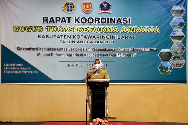 MMCKalteng - Kotawaringin Barat - Melalui Gugus Tugas Reformasi Agraria (GTRA) Bupati Kotawaringin Barat (Kobar) Hj Nurhidayah berharap penataan aset disertai dengan penataan akses untuk kemakmuran masyarakat. Harapan ini disampaikan Bupati dalam sambutannya dalam rapat koordinasi GTRA provinsi Kalimantan Tengah (Kalteng) tahun 2021 di Brits Hotel pada Selasa (22/6/2021).