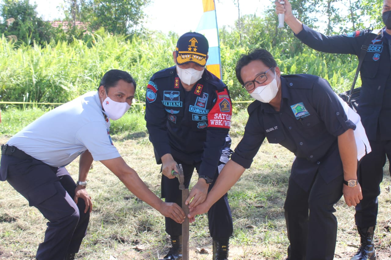 MMCKalteng - Katingan – Kepala Kantor Wilayah (Kakanwil) Kementerian Hukum dan HAM Kalimantan Tengah Ilham Djaya didampingi Kepala Bagian Program dan Humas Diana Soekowati menghadiri secara langsung proses pelaksanaan pembangunan barak bagi Pegawai Lapas Narkotika Kasongan di halaman depan Lapas Narkotika Kasongan pada Rabu (23/6/2021). Berdasarkan Surat Perintah Kerja (SPMK) nomor : 653/1181/Disperkimtan-2/VI/2021 perihal pemberitahuan dimulai kegiatan pembangunan barak pegawai Lapas.