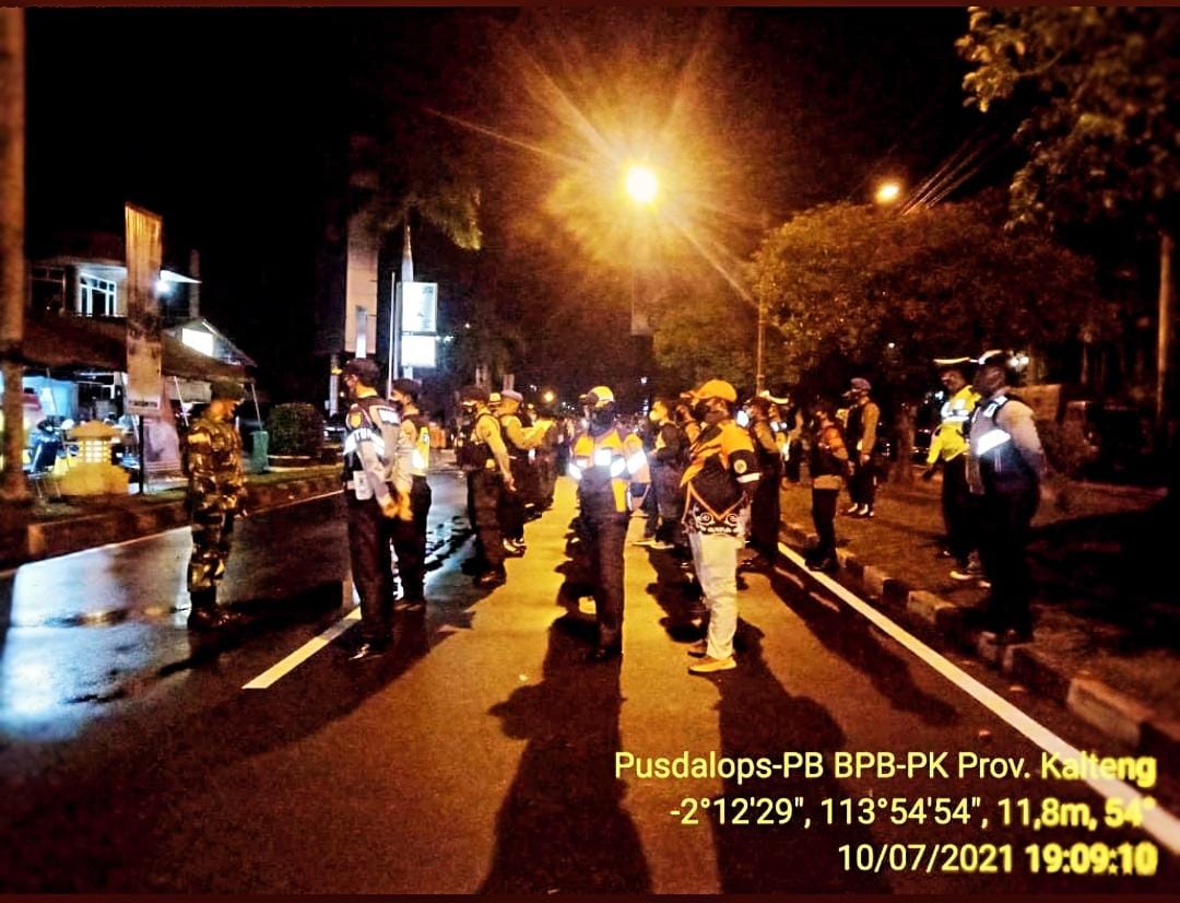 MMCKalteng – Palangka Raya – Sebagai bentuk kerja sama antar Satgas penanganan Covid-19 terkait Instruksi Gubernur Kalteng 180.17/109/2021 tentang perpanjangan Pemberlakuan Pembatasan Kegiatan Masyarakat berbasis mikro dan mengoptimalkan posko penanganan Corona Virus Disease 2019 di tingkat Desa dan Kelurahan di Kalimantan Tengah, tim gabungan Satgas Penanganan Covid-19 melaksanakan patroli dan penindakan pelanggaran protokol kesehatan. Tim gabungan ini terdiri dari TNI/Polri, instansi terkait dan Satgas Penanganan Covid-19, melaksanakan patroli dan penindakan pelanggaran protokol kesehatan dengan sasaran pasar atau pusat perbelanjaan, mall, warung makan, rumah makan, restoran, cafe, pedagang kaki lima, dan lapak jalanan di sekitaran Kota Palangka Raya, Sabtu (10/7/2021) malam.