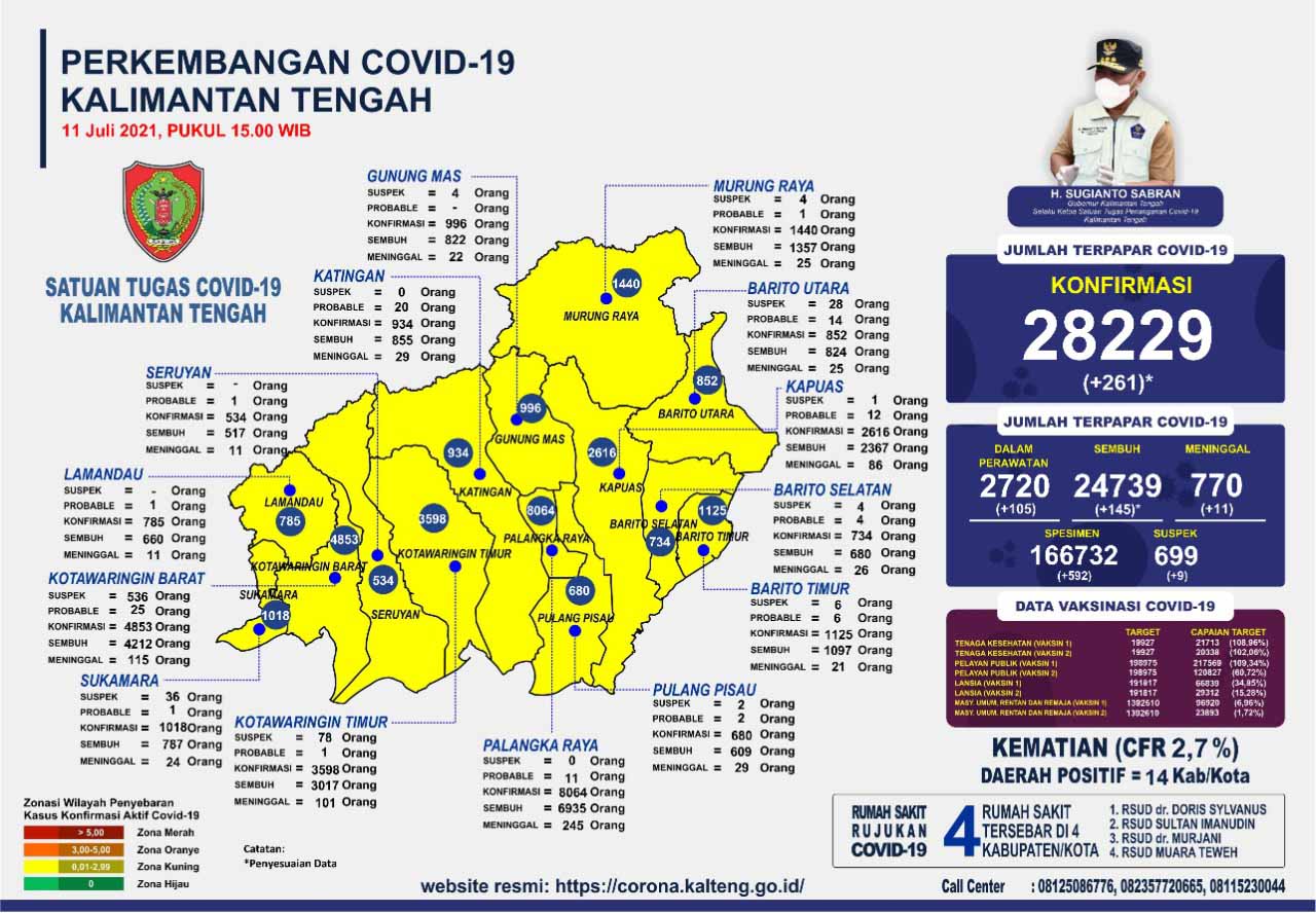MMCKalteng - Palangka Raya - Satuan Tugas Percepatan Penanganan Covid-19 Provinsi Kalimantan Tengah (Prov. Kalteng) mengeluarkan data perkembangan terbaru kasus Covid-19 di Kalteng, Minggu (11/7/2021) Pukul 15.00 WIB. Berdasarkan data yang rilis oleh Media Center Satuan Tugas Percepatan Penanganan Covid-19 Kalteng, jumlah akumulasi data sampai dengan saat ini, pasien konfirmasi positif Covid-19 di Kalteng bertambah sebanyak 261 orang dengan total kasus mencapai 28.229 orang, pasien dinyatakan sembuh sebanyak 145 orang dan pasien dinyatakan meninggal dunia sebanyak 11 orang atau dengan tingkat kematian Case Fatality Rate (CFR) 2,7 persen.