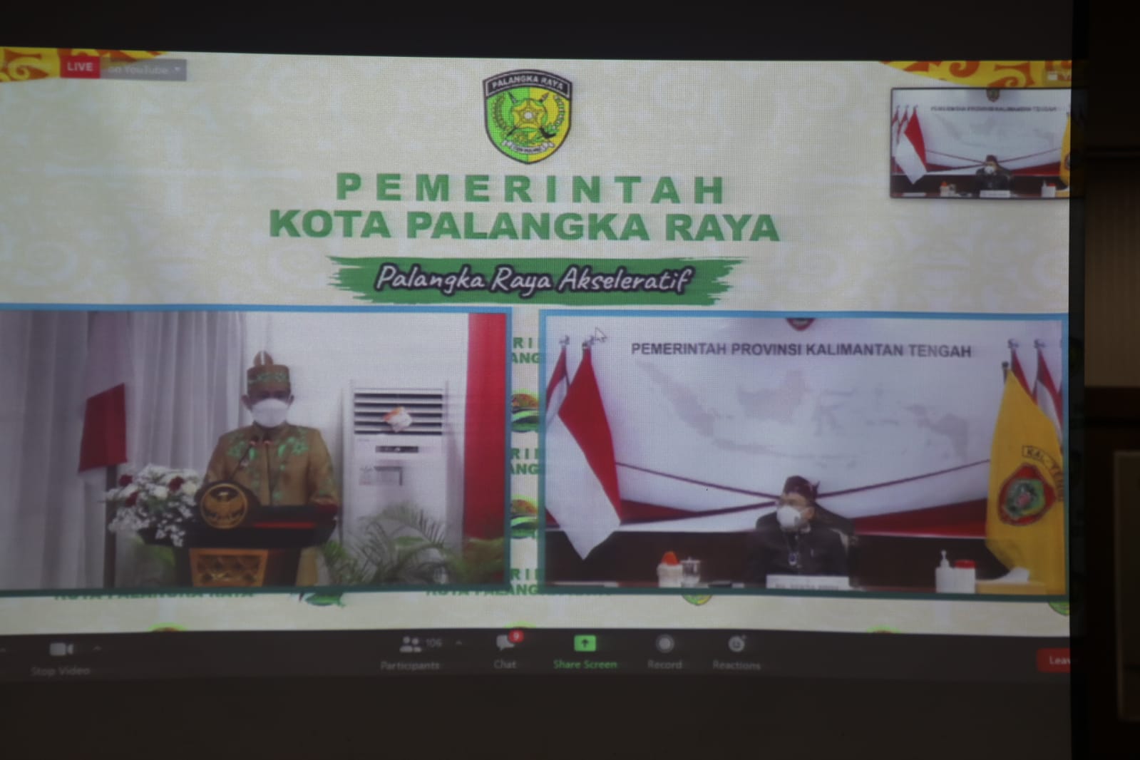 MMCKalteng – Palangka Raya – Plt. Sekretaris Daerah Prov. Kalteng H. Nuryakin menghadiri acara Peringatan Hari Jadi ke-56 Pemerintah Kota Palangka Raya dan Hari Jadi ke-64 Kota Palangka Raya Tahun 2021. Peringatan ini dihadiri secara virtual dari Aula Eka Hapakat, Sabtu (7/7/2021).