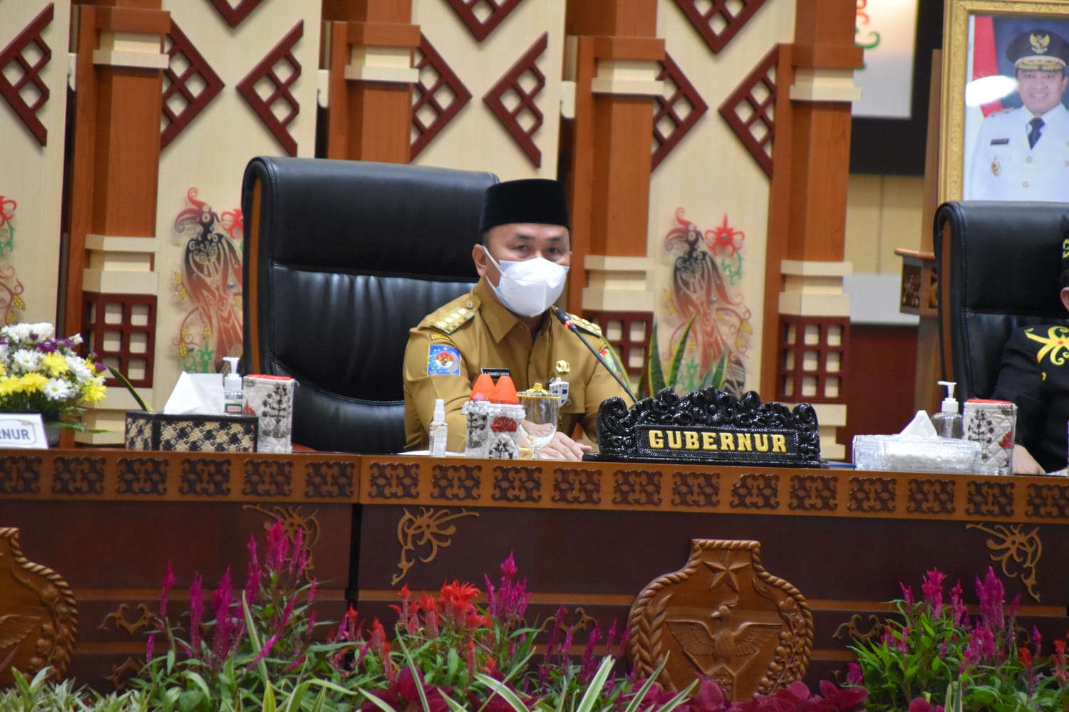 MMCKalteng – Palangka Raya – Gubernur Kalteng H. Sugianto Sabran pimpin Rapat Koordinasi antara Pemprov. Kalteng, Pemerintah Kabupaten/ Kota, Tokoh Masyarakat, Tokoh Agama dan Tokoh Adat serta Pimpinan Perguruan Tinggi se-Kalteng secara virtual. Rakor dihadiri Gubernur dari Aula Jayang Tingang, Kantor Gubernur Kalteng, Senin (26/7/2021). Rakor ini digelar dalam rangka peran serta penanganan Covid-19 di Prov. Kalteng.