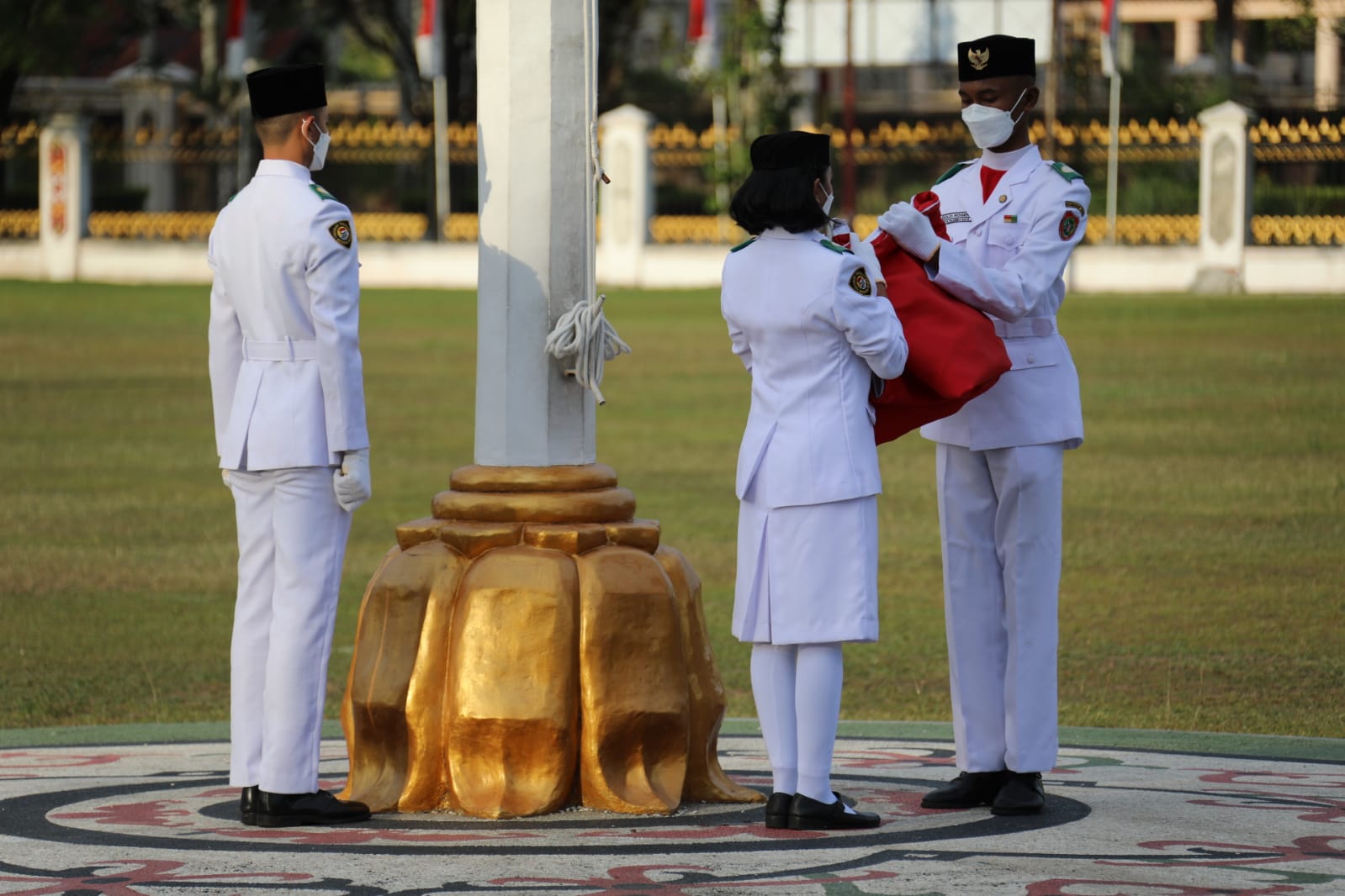Penurunan Bendera sore hari dilakukan oleh 3 orang Pasukan Paskibraka dari beberapa Kabupaten/Kota di Kalteng yakni Ayonia, Goldi Roger dan Leo Ade.