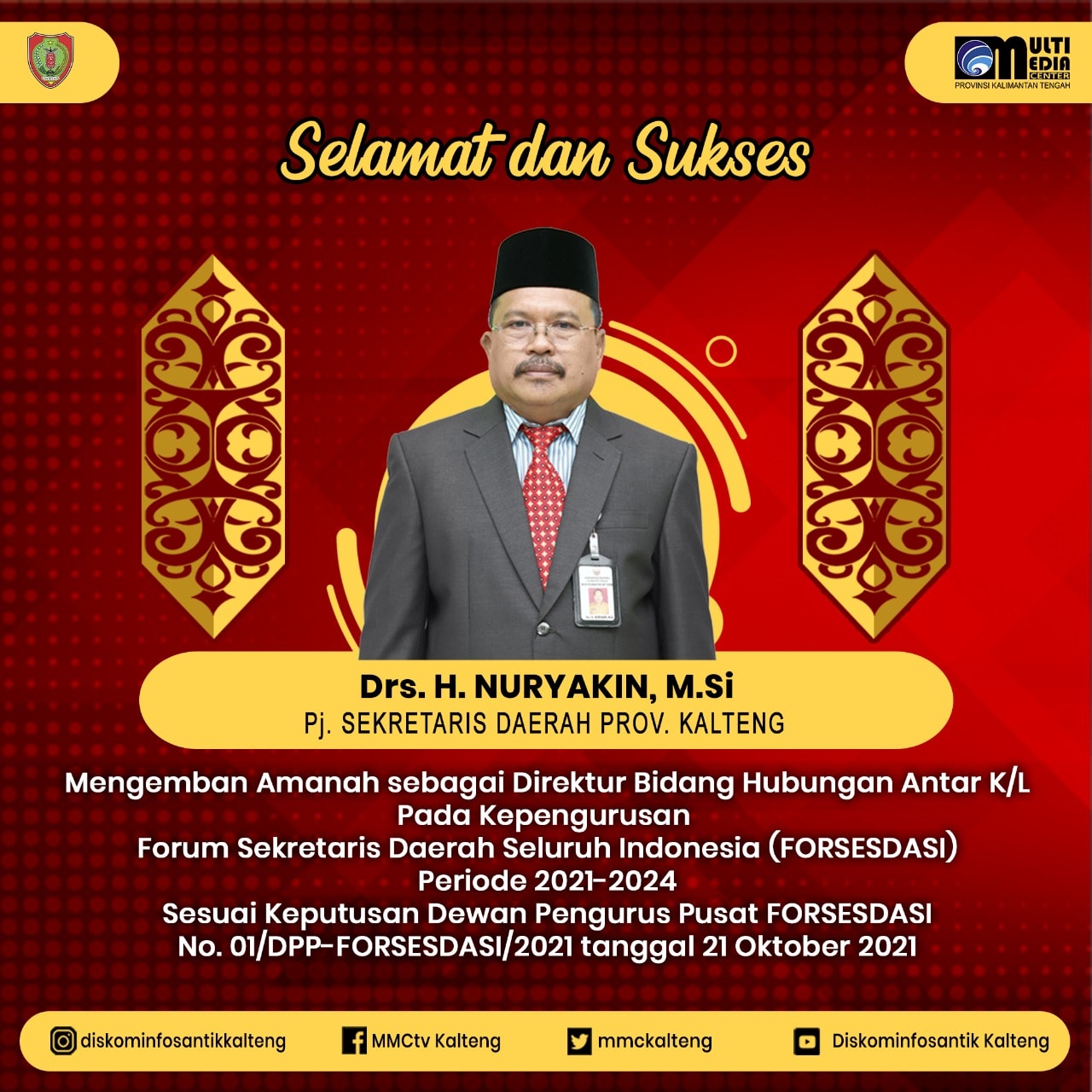 MMCKalteng – Palangka Raya – Pj. Sekretaris Daerah Prov. Kalteng H. Nuryakin resmi memgemban amanah sebagai Direktur Hubungan Antar K/L pada kepengurusan Forum Sekretaris Daerah Seluruh Indonesia (Forsesdasi) Pusat Periode 2021-2024. Amanah tersebut ditetapkan berdasarkan Surat Keputusan Dewan Pengurus Pusat Nomor 01/ DPP-FORSESDASI/2021 Tanggal 21 Oktober 2021 tentang Susunan Dewan Pengurus Pusat Forsesdasi Periode 2021-2024. Hal tersebut disampaikan Plt. Kepala Dinas Kominfosantik Prov. Kalteng Agus Siswadi kepada MMC di Ruang Kerjanya, Kamis ( 21/10/2021).