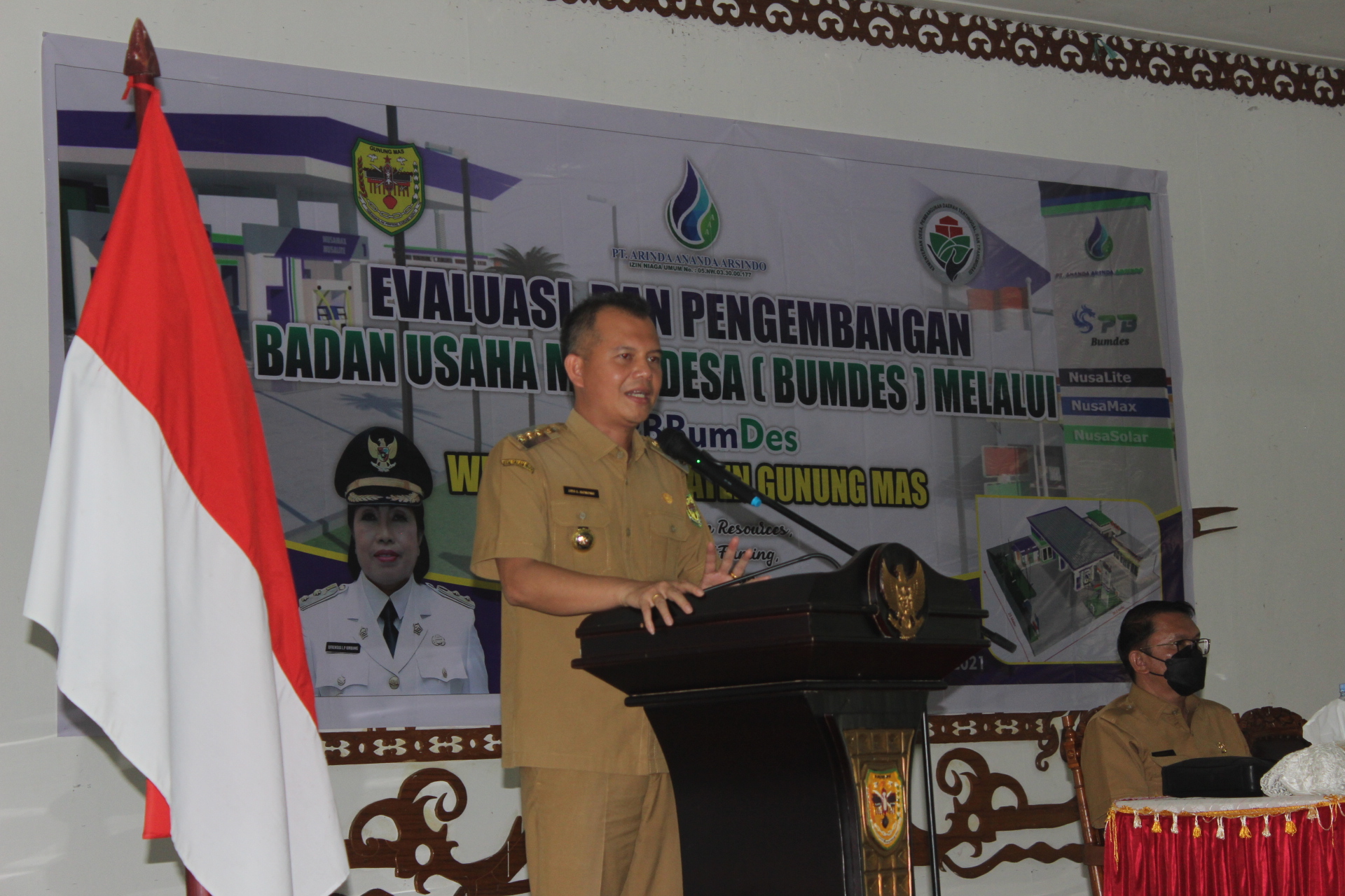 “BUMDes didirikan untuk peningkatan Pendapatan Asli Desa (PADesa). BUMDes harus memiliki perbedaan dengan lembaga ekonomi pada umumnya,” ucap Bupati Gunung Mas Jaya Samaya Monong saat menyampaikan sambutannya pada Kegiatan Evaluasi dan Pengembangan Badan Usaha Milik Desa (BUMDes) Wilayah Kabupaten Gunung Mas di GPU Damang Batu, Selasa (26/10/2021).